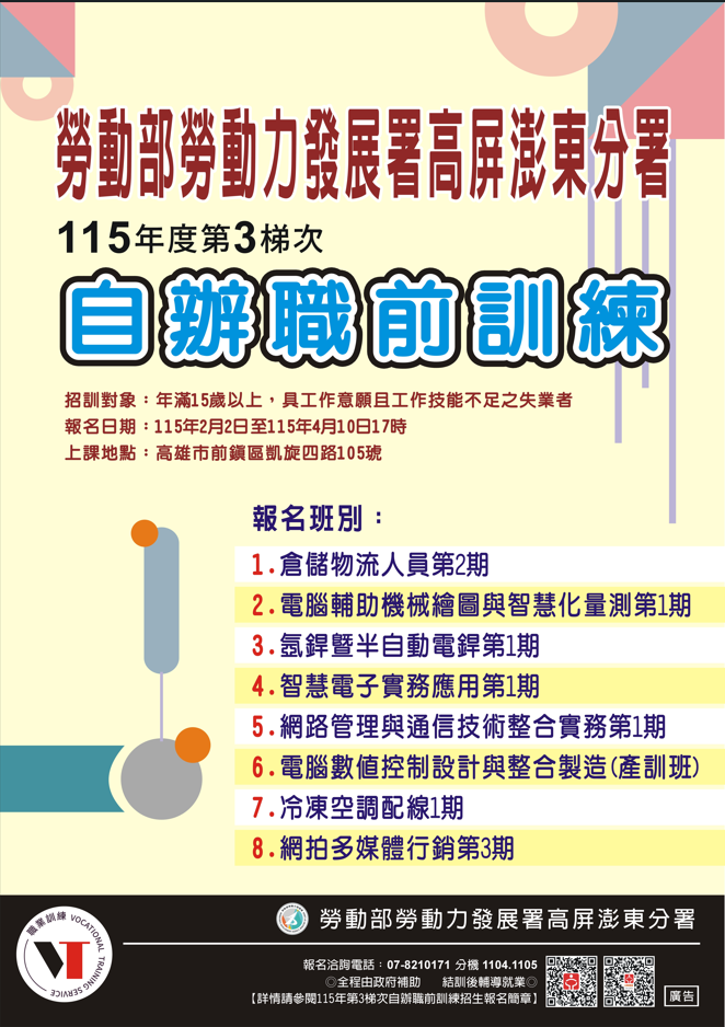 轉知勞動部勞動力發展署高屏澎東分署115年度第3梯次自辦職前訓練