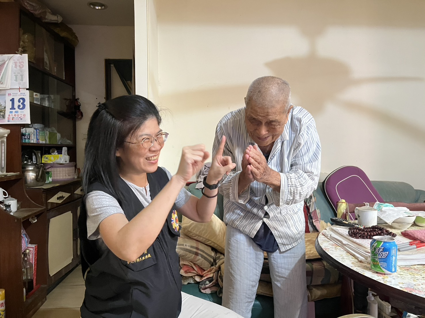 臺北市榮民服務處服務組組長辜雅貞今(13)日上午偕同輔導員及社區服務組組長,前往內湖區關懷百歲榮民及遺眷,轉達誠摯問候與關懷之意。 此次訪視對象其中一位榮民李伯伯已高齡101歲,早期投筆從戎投身軍旅,服役期間秉持職責,恪盡本分,展現堅定意志與崇高的愛國精神,今年由空軍司令鄭榮豐上將頒贈「紀念二戰暨抗戰勝利80週年紀念徽章」,感謝李伯伯對國家的付出。另一位高齡100歲的石伯伯,一生作風敦厚、待人誠懇,信奉一貫道,崇尚靜修與行善,即使年事已高,仍堅持於每週假日前往南港禮佛,不曾間斷。多年如一日的恆心修持,不僅展現其虔誠信念,也體現了榮民長者自律與自省的精神風範。 辜雅貞組長表示,為加強對於榮民的就醫照顧,行政院核定「國軍退除役官兵就醫辦法」修正案。9月1日起領有榮民證的榮民到榮民醫院就醫時,健保部分負擔由輔導會全額補助,不分有無職業及退伍軍階,在榮民醫院就醫時享有同樣照顧。辜組長也特別宣導近期全民普發現金防詐騙資訊,提醒長輩務必提高警覺。強調政府不會以簡訊或電子郵件通知領錢登錄,更不會以電話要求前往ATM或網銀操作轉帳,呼籲長輩務必小心辨識。