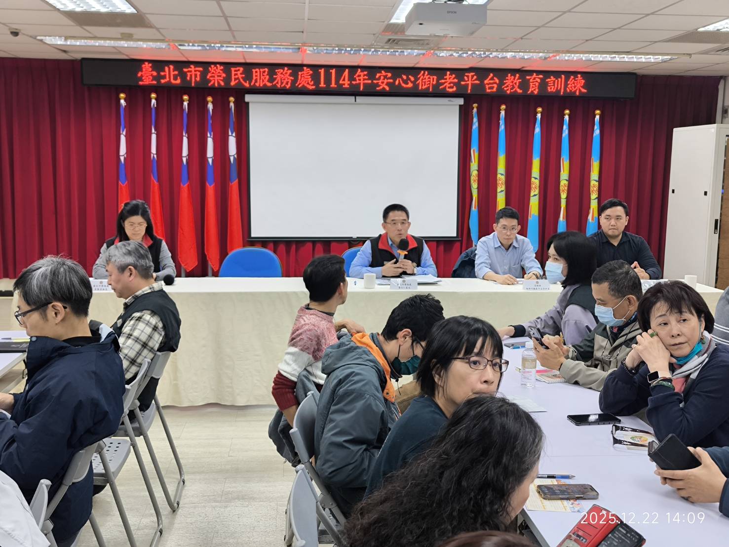 因應臺灣自今(114)年起步入超高齡化社會,為落實退輔會積極推動的「社區榮民照護數位轉型」政策,臺北市榮民服務處於12月22日辦理「安心御老平台教育訓練」,邀請平台建置工程師擔任授課講師,透過系統化教學與實務操作,協助第一線服務人員熟悉平台功能與作業流程,透過持續辦理教育訓練,有助於強化第一線同仁對平台精神與操作實務的理解。 本次教育訓練以該處責任區輔導員、社區服務組長及相關業務同仁為主要對象,課程內容涵蓋安心御老平台之系統架構、角色分工、每月常規流程、訪視打卡機制及個案照護應用情境,並由承商專業團隊進行實際操作示範與問題說明,協助同仁將科技工具有效融入日常訪視與服務工作,強化即時回報及跨單位協作能力。 榮服處處長黃信仁表示,安心御老平台是以「一點生變、多方應援」為核心理念,結合榮服處、各醫院、各長照體系及家庭支持網絡,透過智慧科技即時串接照護資訊,使相關人員能更早掌握長者狀況、即時啟動協助機制,降低高齡榮民(眷)面臨突發風險孤立無援,甚至肇生孤獨死憾事。 黃處長並指出,該處於12月10日邀集臺北市政府衛生局、社會局、民政局,以及臺大醫院、臺北市立聯合醫院等單位,共同召開「安心御老平台說明暨研討會」,就平台推動模式、跨機關合作機制及實務運作經驗進行交流,廣納各界建言,作為後續精進平台功能與服務流程的重要參考,展現該處積極推動跨域整合、共同守護高齡榮民(眷)的決心。
