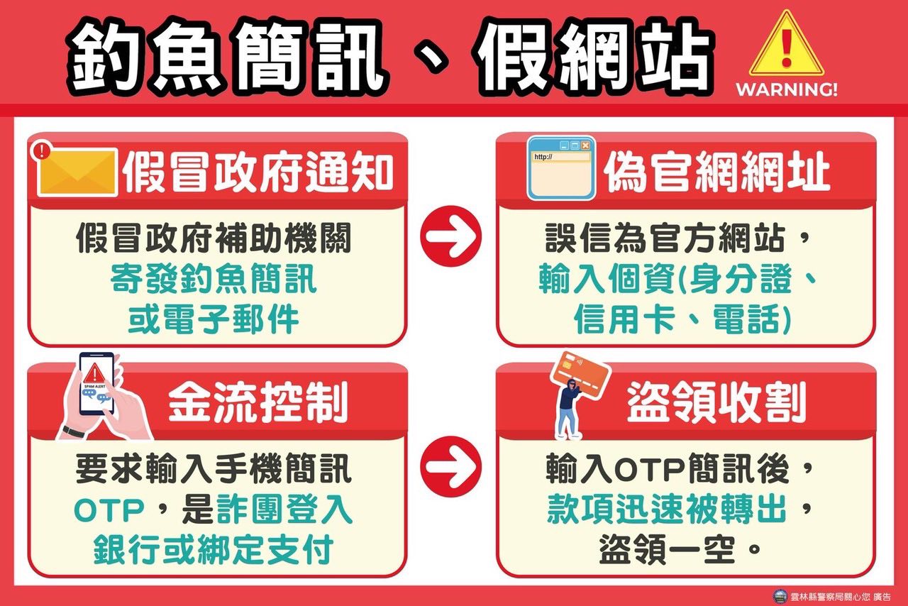 政府普發現金1萬元,這段期間務必要特別提高警覺防範詐騙!詐騙集團動起歪腦筋,有人假冒公務機關、檢警打電話恐嚇,也有人傳假簡訊、假網站要你點連結填資料,千萬別上當!