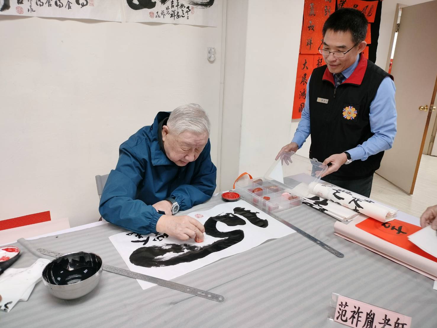 農曆丙午馬年新春將屆,為弘揚傳統書法藝術並增添年節喜氣,臺北市榮民服務處今(5)日舉辦「丙午馬年迎新春揮毫贈春聯愛心活動」,邀請書法老師現場揮毫,題寫寓意吉祥的春聯,致贈洽公榮民眷、退伍軍人社團及友好單位,現場洋溢濃厚年味與溫馨祝福氣氛。 本次活動由處長黃信仁主持,邀請欣欣大眾百貨公司、欣湖天然氣公司、中華民國中央軍事院校校友總會、新北市新聞記者職業工會及臺北市青溪總會等多個退伍軍人社團及社福團體代表共襄盛舉,透過揮毫贈聯活動,傳遞新春祝福與關懷心意,展現榮服處長期深耕榮民眷服務照顧工作的成果與溫度。 活動現場除向各團體長期支持與協助榮民眷服務表達誠摯感謝外,並播放兩部紀錄影片。其一為「走過歷史的榮民」,透過影像回顧榮民先進自烽火歲月走來,歷經時代變遷與社會建設的生命歷程,呈現其一生為國家、社會默默付出的精神與價值;其二為榮服處服務花絮影片,呈現榮服處同仁及志工長期投入訪視關懷、資源連結與照顧服務的實際情形。透過影片播放,讓與會來賓更具體了解榮民走過歷史的貢獻,以及榮服處持續守護榮民眷的服務成果與用心。 本次受邀揮毫的書法老師,包括榮民范祚胤將軍、淡水八里書畫會郭香玲會長、簡孟樹副會長、高素喜副會長,以及榮欣志工江茂村老師等5位,分別以楷、行、草、隸、篆等不同書體現場揮毫,展現精湛書藝,吸引洽公榮民眷及現場來賓駐足欣賞,一同感受筆墨間的年節喜氣。 另為擴大活動關懷層面,臺北市榮民服務處亦藉由此次邀請書法老師書寫春聯之機會,將滿載祝福的愛心分享予國軍高齡單身退舍的榮民伯伯們。本次藏頭春聯內容係由黃信仁處長特別為退舍榮民發想,融入平安、吉祥與新春祝福意涵,再由書法老師揮毫書寫,專為希海伯伯、坤明伯伯及南城伯伯量身題贈,讓長輩們在新春佳節前夕,感受到社會溫暖與節慶祝福,安心歡喜過好年。 黃信仁處長表示,農曆春節將屆,家家戶戶除舊布新、貼春聯迎春納福,十分感謝5位書法老師熱心參與新春揮毫活動,讓榮民眷與同仁在迎新送舊之際,感受濃厚年味與溫暖祝福;並藉此機會向榮民眷拜早年,祝福大家丙午馬年「馬到成功、吉祥如意、闔家安康」。