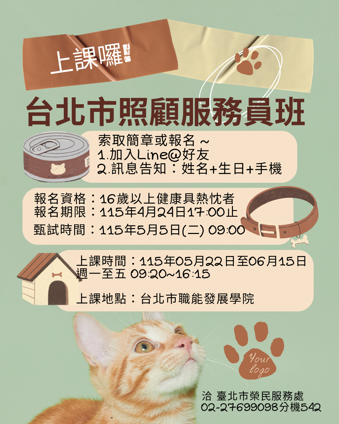 台北市照顧服務員班 上課時間:115年5月22日至6月15日 上課地點:台北市職能發展學院 報名洽02-27699098分機542,加入就業站line@---------好友ID輸入 @slt9743x 台北市榮民服務處