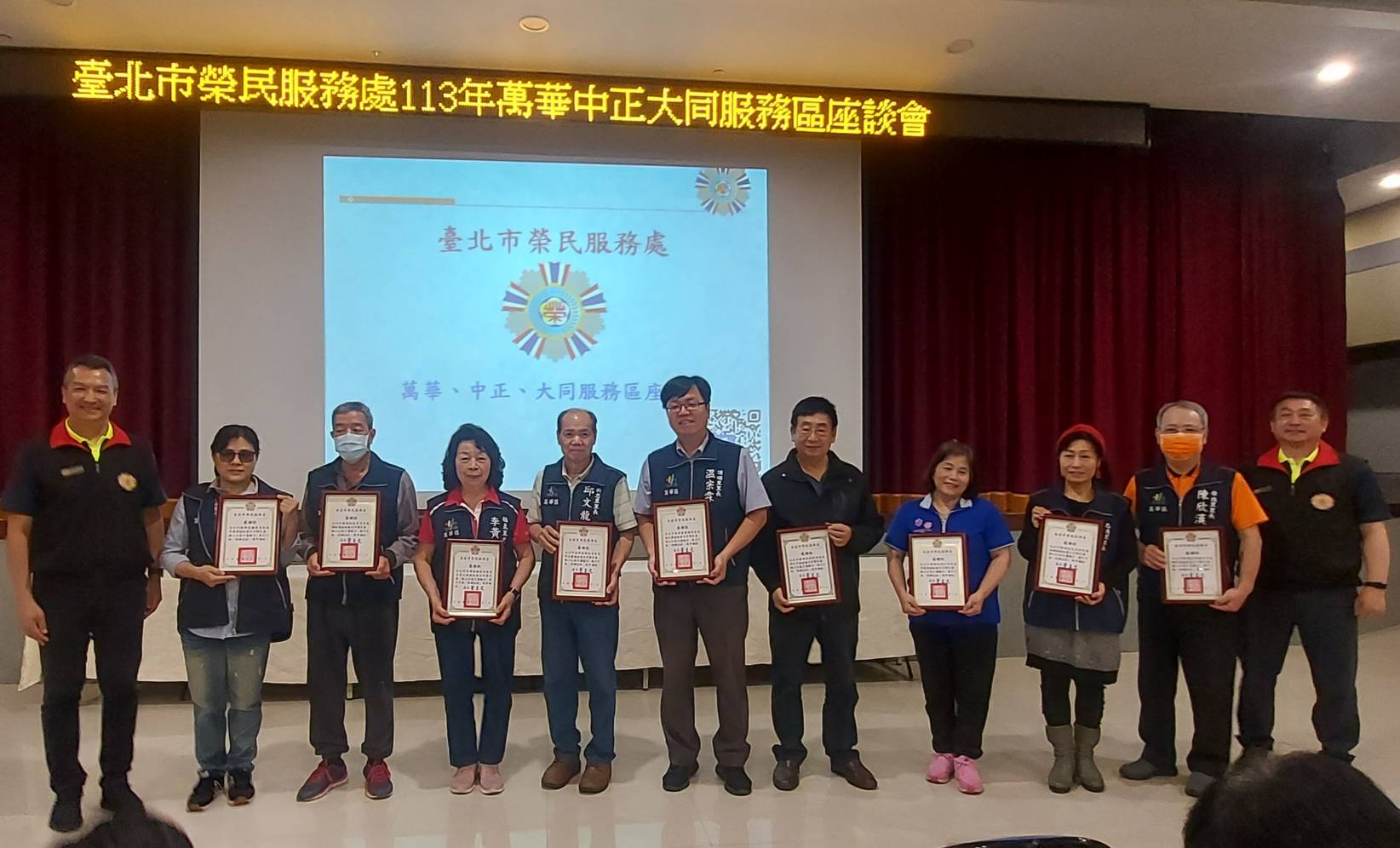 臺北市榮民服務處為傾聽退除役官兵心聲、關懷生活狀況,今(11)日上午在萬華區公所大禮堂結合兵役局舉辦113年「中正、萬華暨大同區服務區座談會」,由董玉文處長主持,座談會前播放「榮民榮眷基金會微電影-夢想起飛榮光勇士生命故事」等多部感人微電影,會中宣導輔導會服務照顧最新政策,藉由面對面溝通,傾聽心聲,獲得與會退除役官兵的肯定與感謝。 為增進多元化服務效能,會中除安排各項業務簡報並對與會人員提問即時答覆外,更特別邀請臺北市警局萬華分局針對近來新型態詐騙手法,透過趣味問答方式提醒退除役官兵避免財物受損;另連結萬華區老服中心、社福中心、健康中心、臺北榮民總醫院、後備軍人輔導中心等網絡資源單位共同與會宣導相關服務。會場並設置就學就業輔導、就醫輔具申請收件、免費助聽器檢測諮詢、榮欣志工招募及醫護站等服務櫃台,提供貼心有感服務。為向平時與榮服處共同關懷榮民眷的里長表示衷心謝意,特別由董處長親自頒發感謝狀向游秋蓮、李重華…等十位里長致意。 董玉文處長致詞表示,榮服處除戮力執行輔導會就學、就醫、就養、就業、退除給付及服務照顧等六大核心業務外,更持續精進提供有感服務,使功在國家的退伍袍澤,均能安心的生活,享有更完善之服務與照顧,得到與會退除役官兵的肯定,座談會在溫馨互動中圓滿結束。