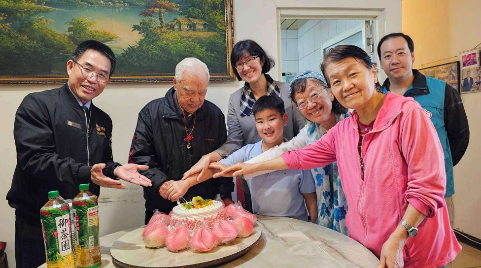 臺北市榮民服務處處長黃信仁於今(26)日率領服務團隊與榮欣志工,親赴文山區為百歲榮民彭爺爺祝壽。現場眾人高唱〈生日快樂歌〉與〈黃埔祝壽歌〉,由黃處長代表總統賴清德及行政院長卓榮泰致贈壽屏,並代輔導會主委嚴德發佩掛壽桃紀念金飾,致上最深切的敬意與福壽祝福。