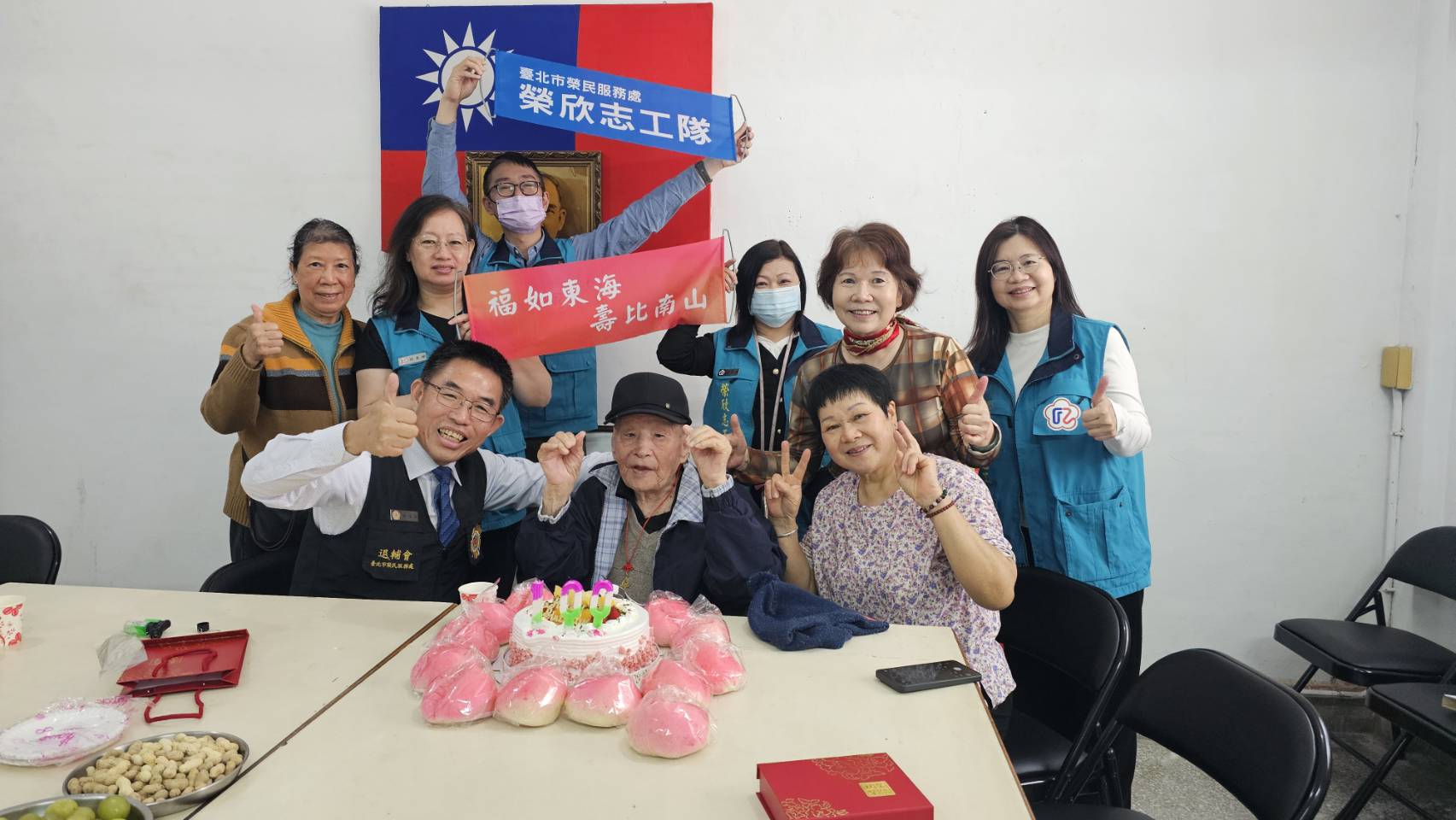 為祝賀信義區大我新莊王爺爺百歲壽辰,臺北市榮民服務處處長黃信仁於今(23)日率領服務團隊與榮欣志工親赴退舍祝壽。活動中,黃處長代表總統及行政院長致贈祝賀壽屏,並代輔導會主委嚴德發佩掛壽桃紀念金飾。在〈生日快樂歌〉與〈黃埔祝壽歌〉的歡快旋律中,王爺爺與眾人共同切開蛋糕,將喜悅分享給每位陪伴的袍澤與志工。