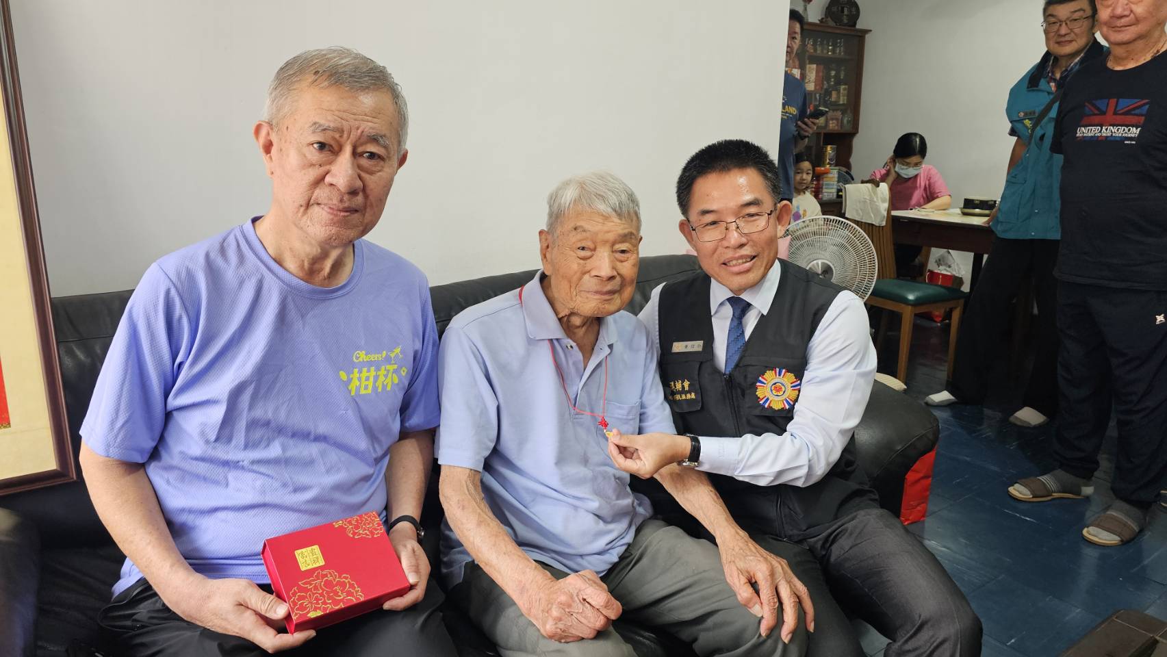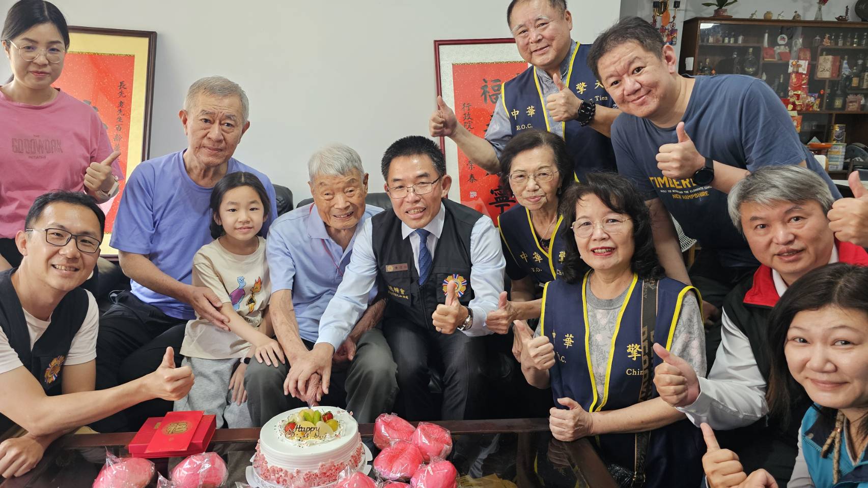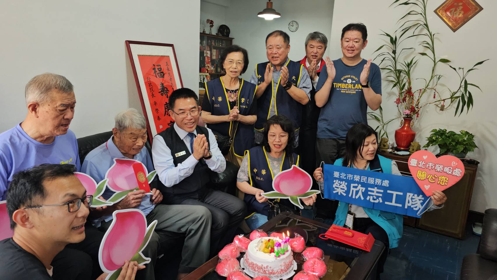 臺北市榮民服務處今(21)日前往空軍退役榮民王爺爺家中,慶賀其百歲壽辰。此次慶生會榮服處聯袂中華民國擎天協會常務理事張湘麟、期刊總編輯金嘉珍、主編輯陳瑞銘及合唱團副團長張嘉銘等嘉賓共襄盛舉,致力於公益的擎天協會,透過嘹亮歌聲走訪各地榮家,此次更將溫暖親自送到百歲的王爺爺家中。 王爺爺出生於民國16年,原籍江蘇省武進縣,年少即胸懷大志投身軍旅,畢業於國防管理學校專8期。服役期間,王爺爺憑藉專業的管理長才,以嚴謹、細緻的態度默默守護部隊運作,並於民國74年官拜空軍中校榮譽退伍。為了這難得的百歲大壽,王爺爺的兩位姪子及家屬特別由南部專程北上,全家人齊聚一堂,在慶壽盛典中展現深厚的情感。 慶生會現場,處長黃信仁首先代表總統及行政院長致贈祝賀壽屏,並代表輔導會嚴德發主任委員,親手為王爺爺掛上象徵福壽安康的壽桃造型紀念金飾,隨後,中華民國擎天協會亦由代表致贈生日禮金,表達對老前輩的暖心慰問。活動的高潮由擎天合唱團與榮服處團隊帶領全場共同獻唱《生日快樂歌》與《黃埔祝壽歌》,嘹亮且動人的專業合聲迴盪全場,讓王爺爺感動地表示:「這是我一百年的人生之中,最快樂的一天!」。 黃處長表示榮服處始終秉持榮民的小事,就是我們的大事之初衷,持續推動輔導會「安心御老平台」整合性服務計畫,確保高齡長輩能享有最優質且便捷的醫療照護,以更細緻、更有溫度的關懷,守護每位功在國家的長者,讓榮民都能尊榮安享晚年。