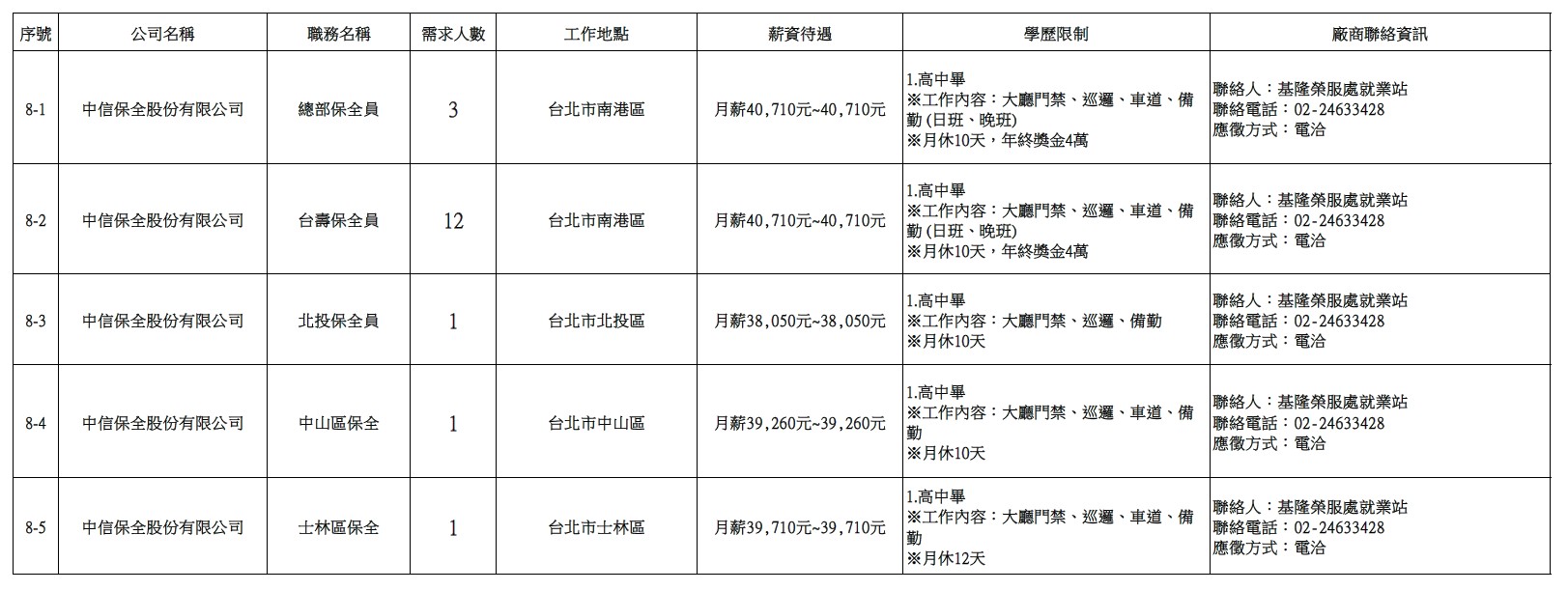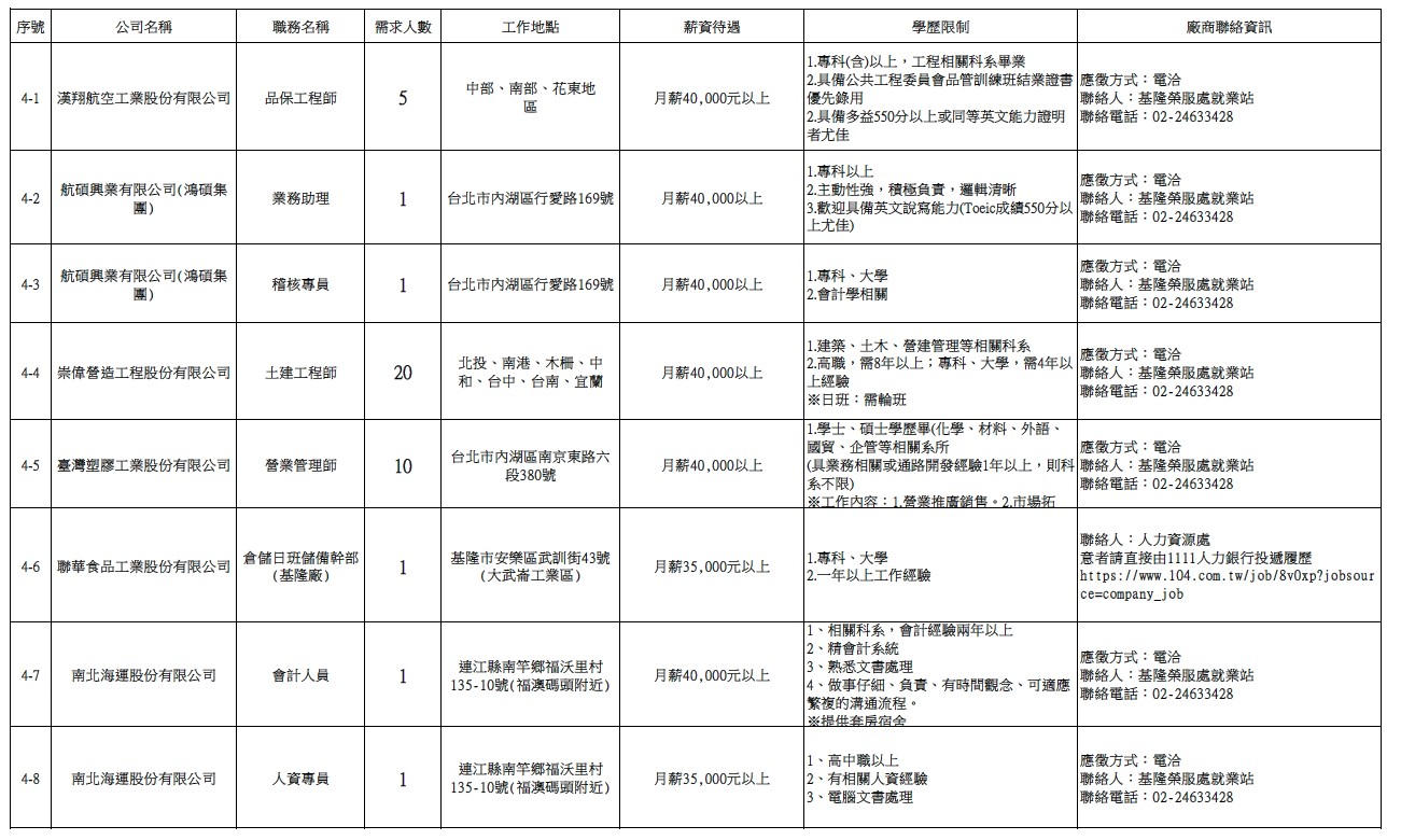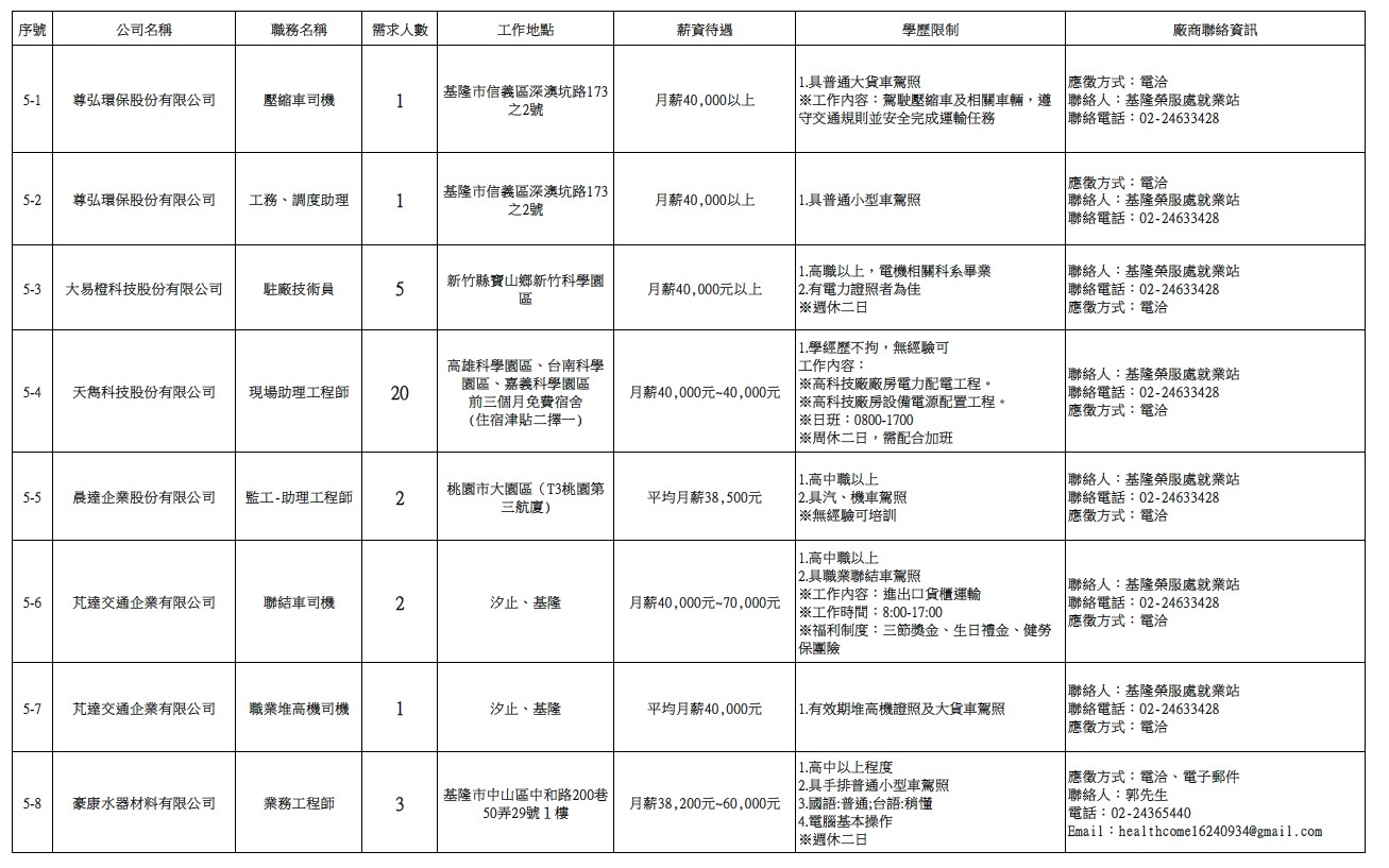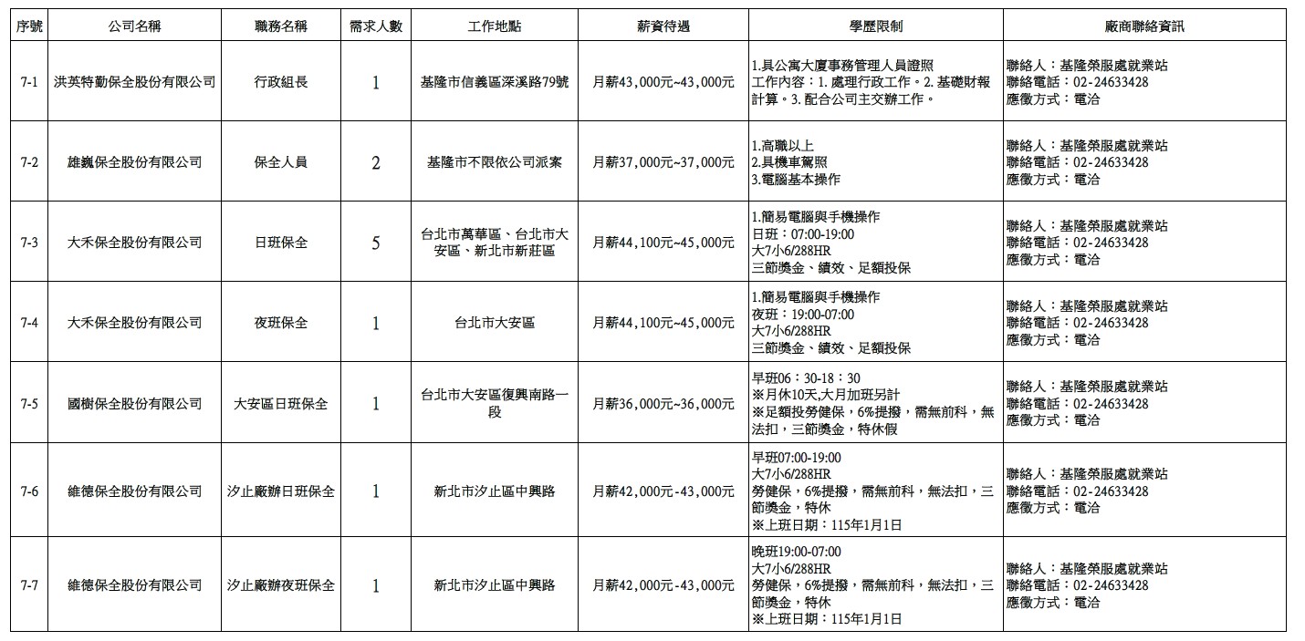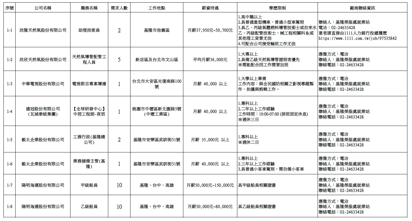 發布日期:115-02-24 資料來源:基隆市榮民服務處 【基隆市榮服處】廠商職缺表(115.02.24)-1 相關照片 【基隆市榮服處】廠商職缺表(115.02.24)-2 【基隆市榮服處】廠商職缺表(115.02.24)-3 【基隆市榮服處】廠商職缺表(115.02.24)-4 【基隆市榮服處】廠商職缺表(115.02.24)-5 【基隆市榮服處】廠商職缺表(115.02.24)-6 【基隆市榮服處】廠商職缺表(115.02.24)-7 【基隆市榮服處】廠商職缺表(115.02.24)-8 附件下載 檔案名稱 更新日期 下載次數 【基隆市榮服處】廠商職缺表(115.02.24).pdf 115-02-24 4