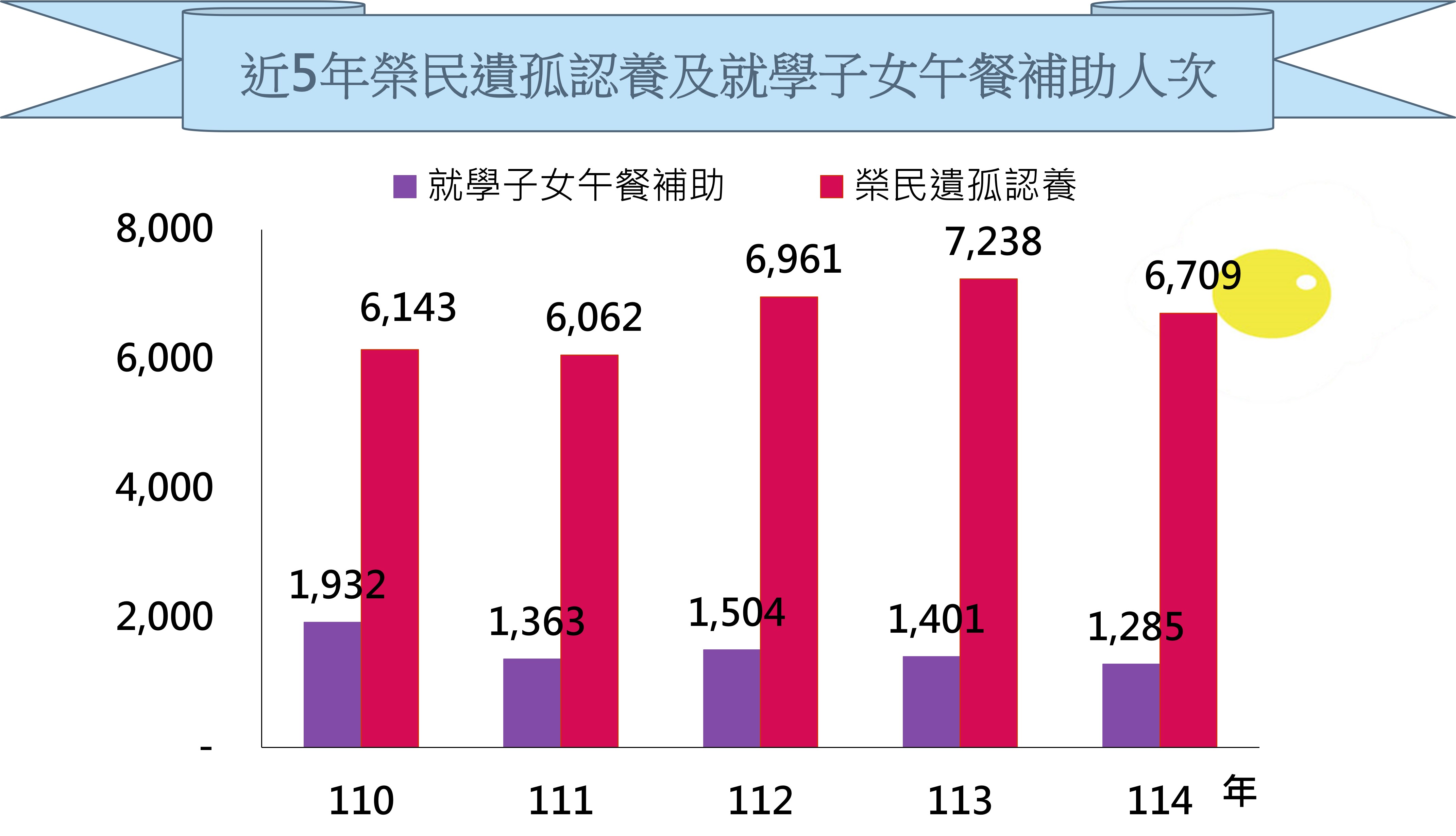 114年底遺孤認養6,709人次;午餐補助1,285人次