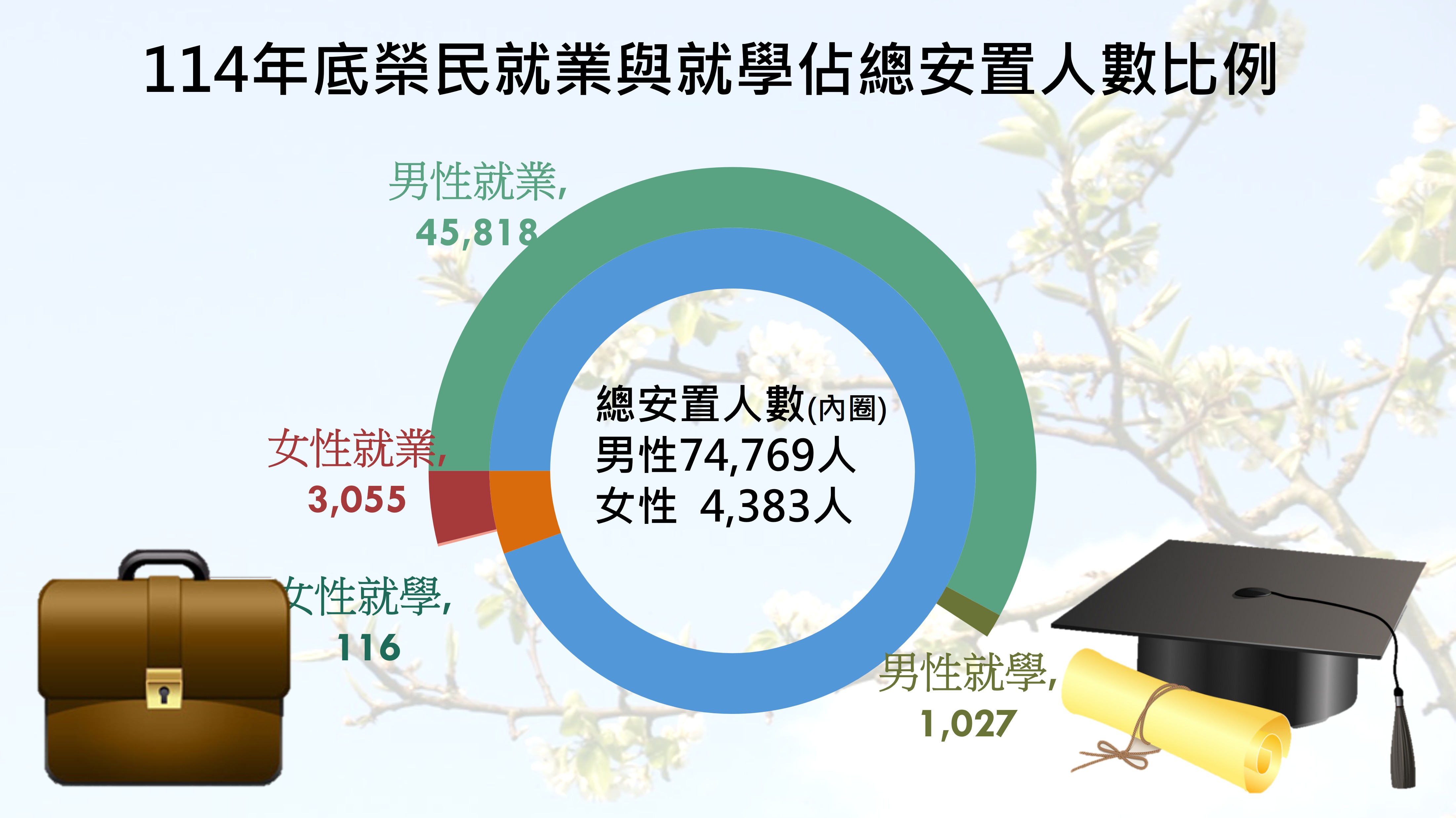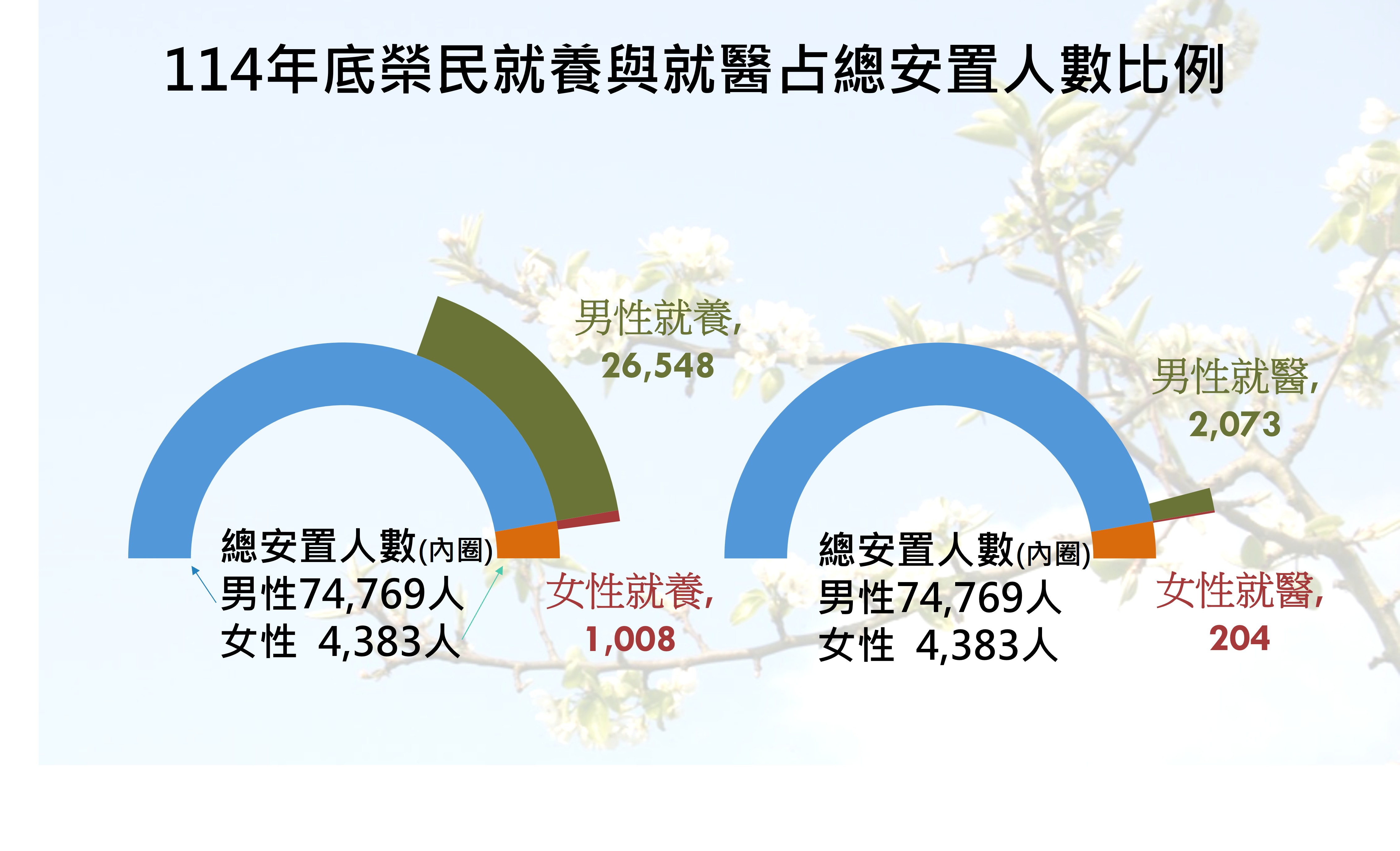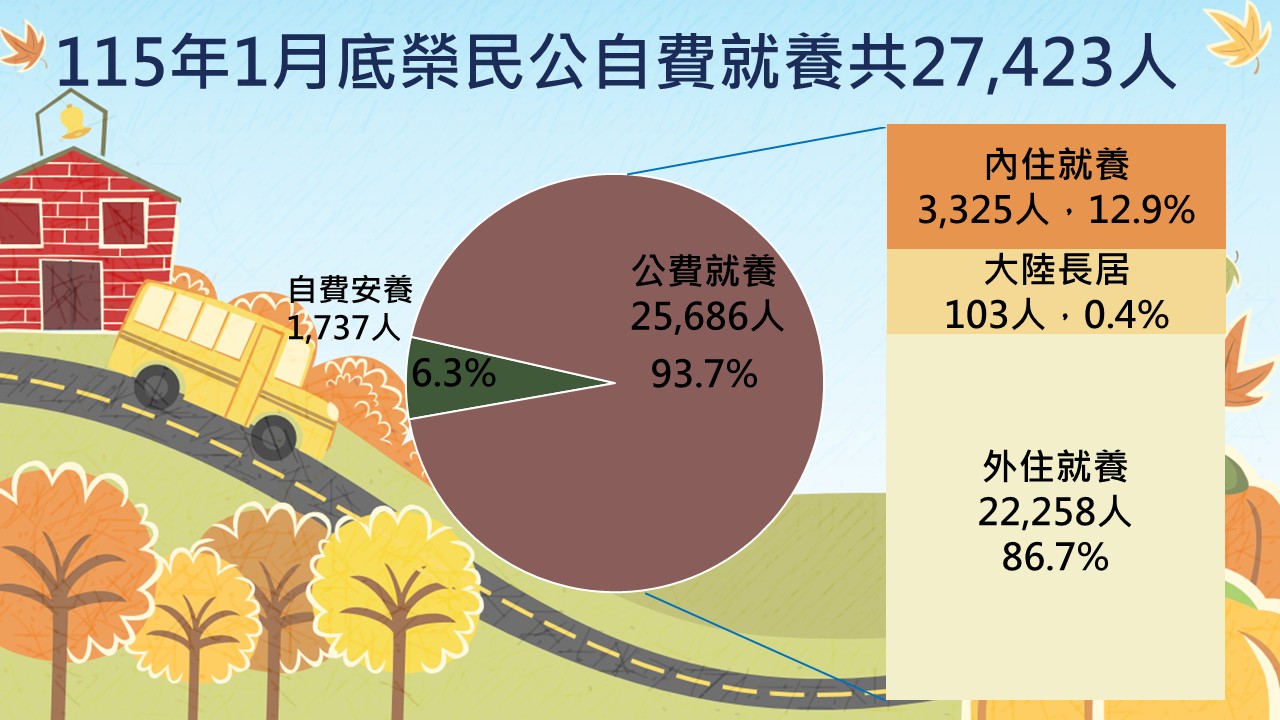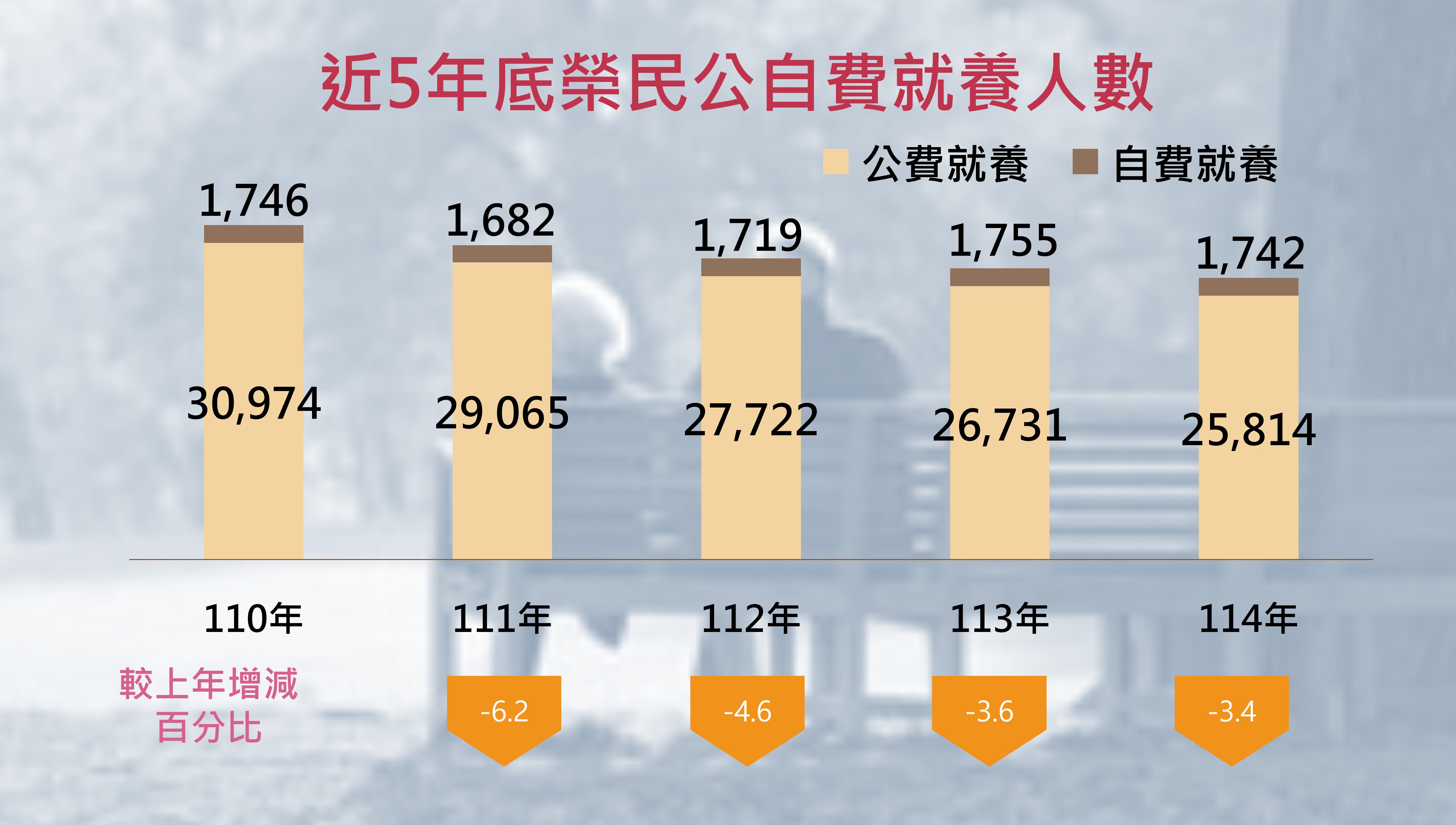 114年底公費就養25,814人,自費就養1,742人;年減3.4%