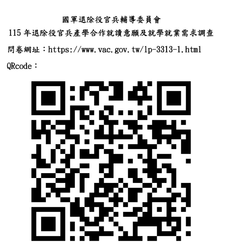 為瞭解退除役官兵就讀產學合作意願及就學就業需求,作為推動115年產學合作參考。 問卷網址:https://www.vac.gov.tw/lp-3313-1.html