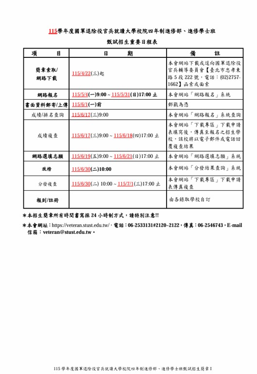 國軍退除役官兵就讀大學校院四年制進修部、進修學士班甄試招生委員會 委辦單位:國軍退除役官兵輔導委員會 地 址:11025臺北市信義區忠孝東路5段222號 電 話:(02)2757-1661 臺北市榮民服務處 承辦學校:南臺科技大學 地 址:710臺南市永康區尚頂里南臺街1號 電 話:(06)253-3131轉2120~2122(綜合業務組) 傳 真:(06)254-6743 網 址:https://veteran.stust.edu.tw 附件下載