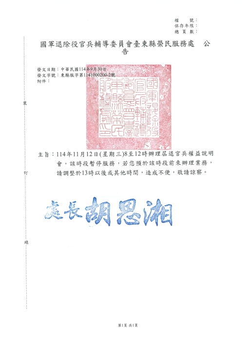 114年11月12日(星期三)8至12時辦理屆退官兵權益說明會,該時段暫停服務,若您預於該時段前來辦理業務,請調整於13時以後或其他時間,造成不便,敬請諒察。