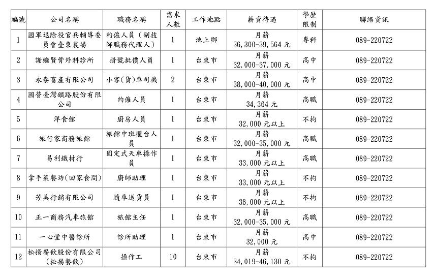 【臺東榮服處】廠商職缺表_115.01.13