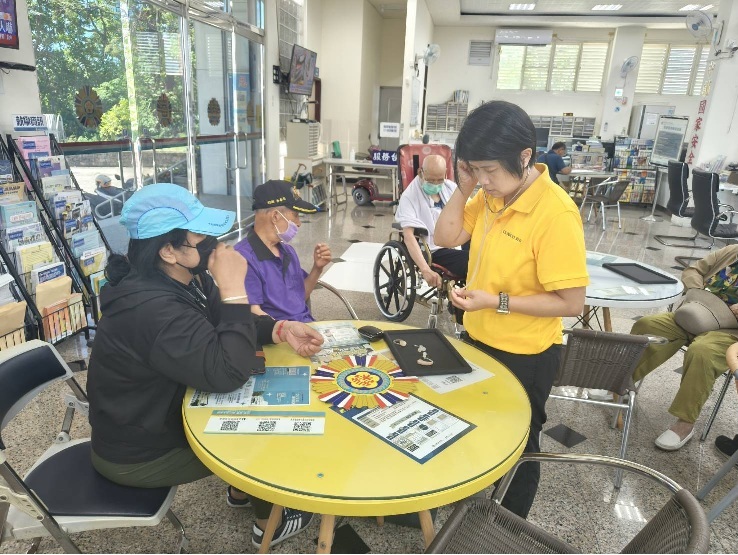 科林助聽器公司聽力師協助榮民配戴助聽器、檢修調整並向家屬進行衛教並對話測試