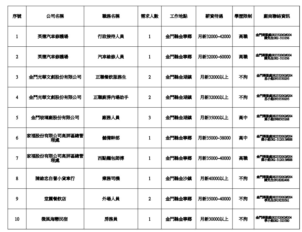 發布日期:114-11-06 資料來源:金門縣榮民服務處 【金門縣榮服處】廠商職缺表(114.11.06) 附件下載 檔案名稱 更新日期 下載次數 【金門縣榮服處】廠商職缺表(114.11.06).pdf 114-11-06 2