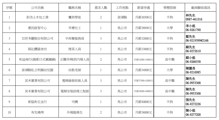 發布日期:114-12-22 資料來源:澎湖縣榮民服務處 【澎湖縣榮服處】廠商職缺表(114.12.22) 附件下載 檔案名稱 更新日期 下載次數 【澎湖縣榮服處】廠商職缺表(114.12.22).pdf 114-12-23 4