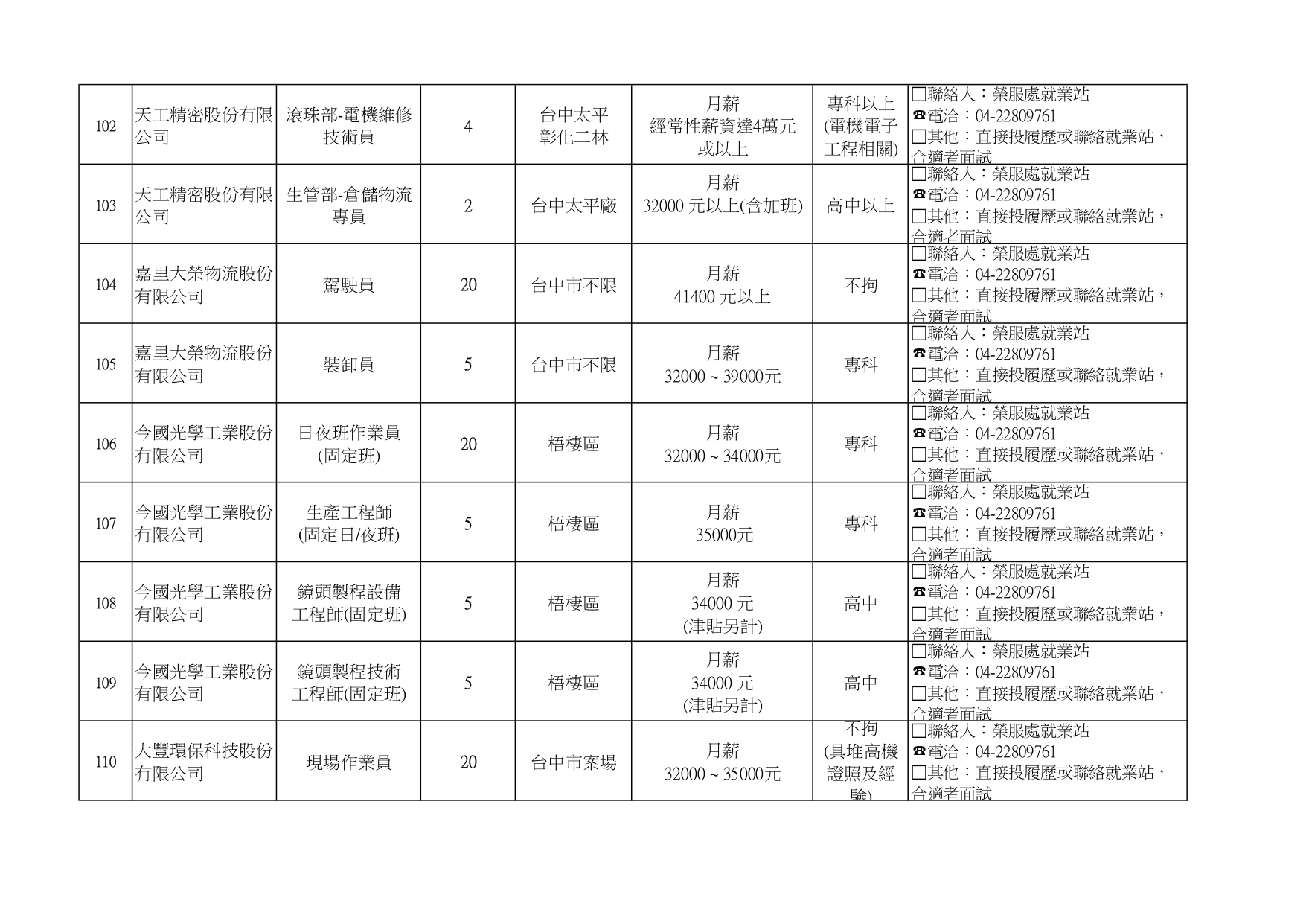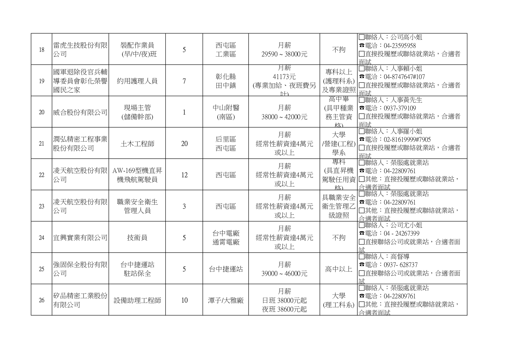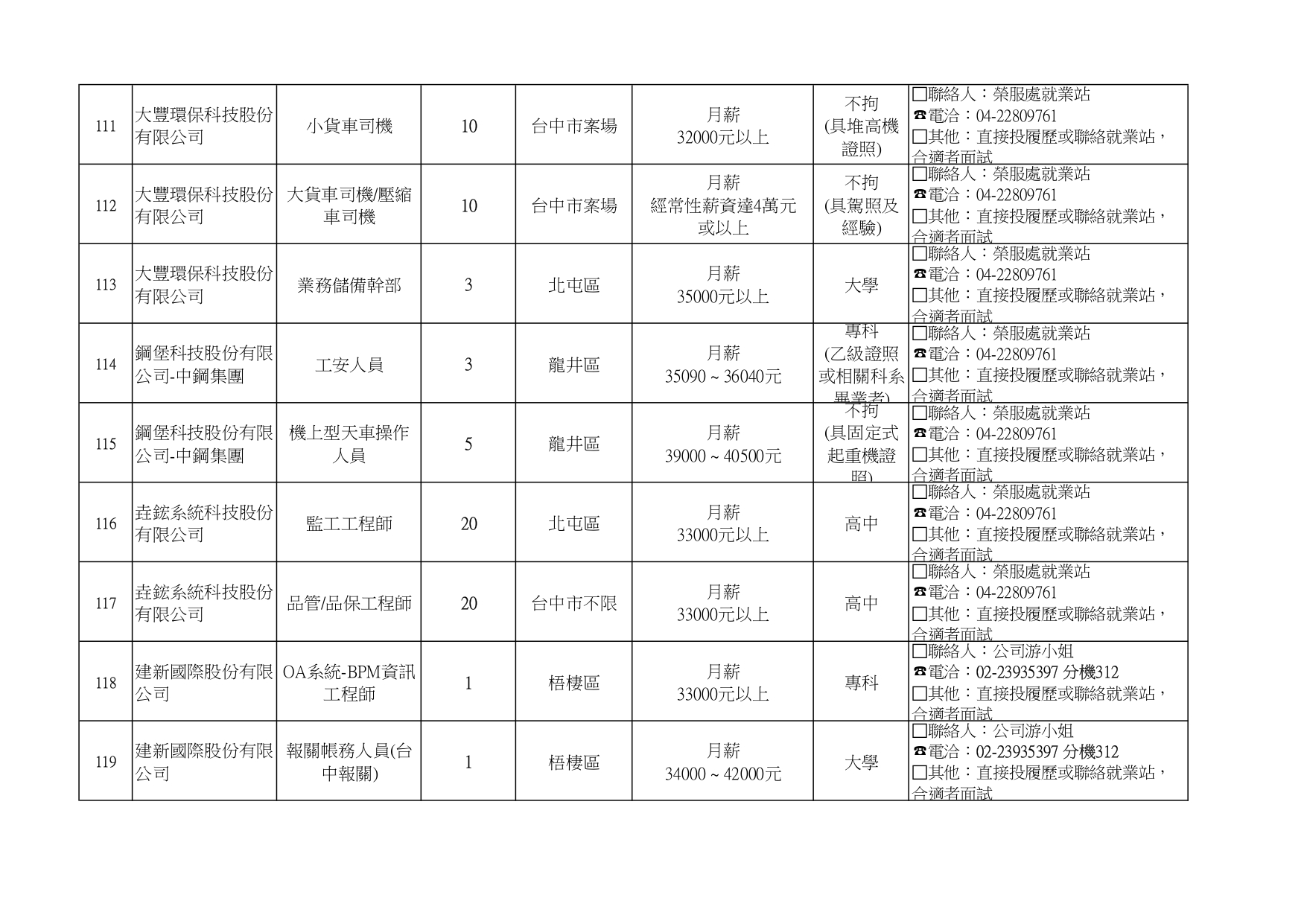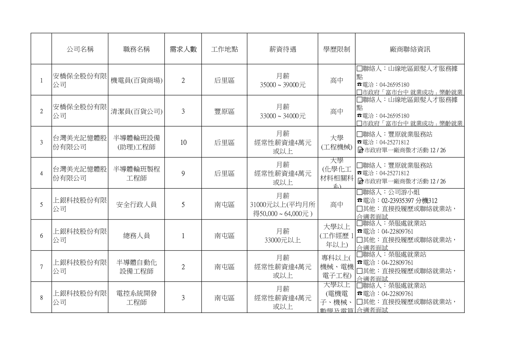 臺中市榮民服務處就業巿場快報(114. 12.23 最新廠商職缺表)