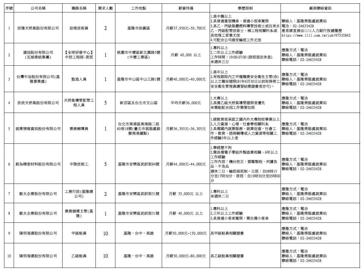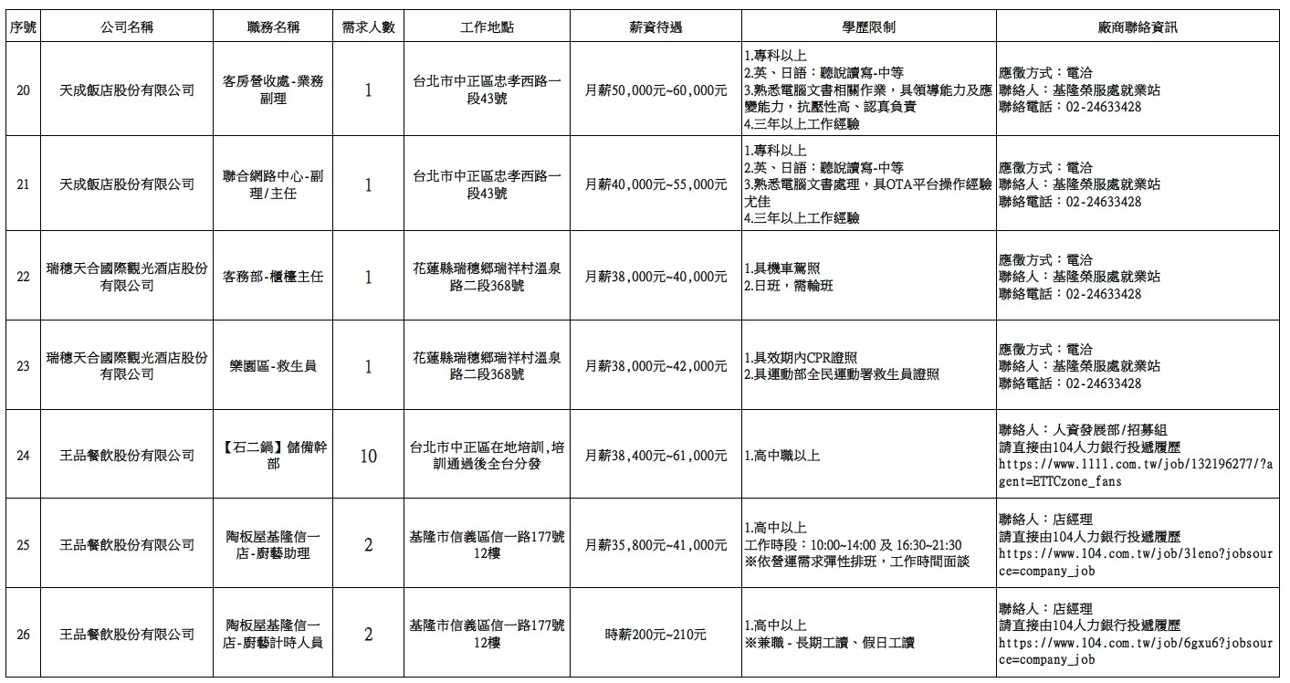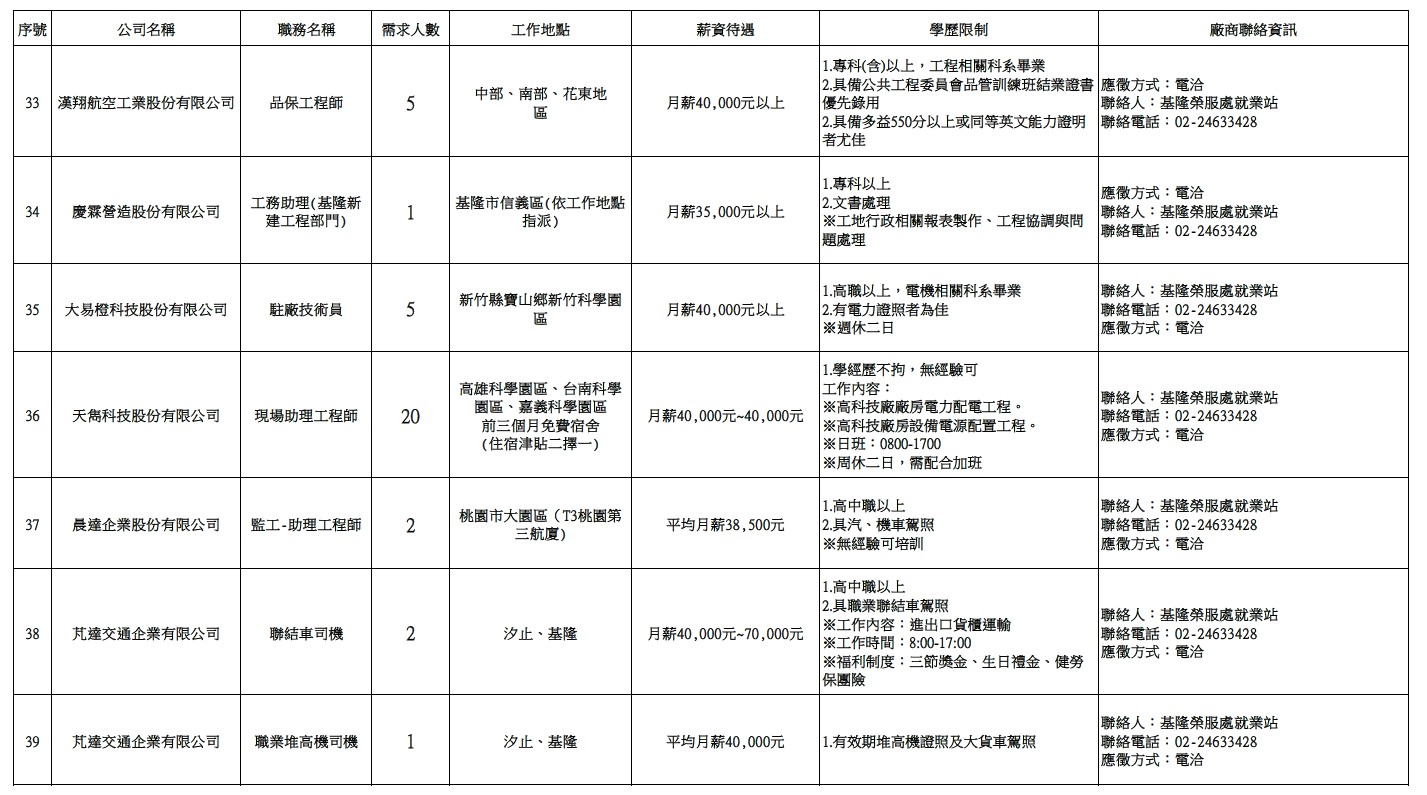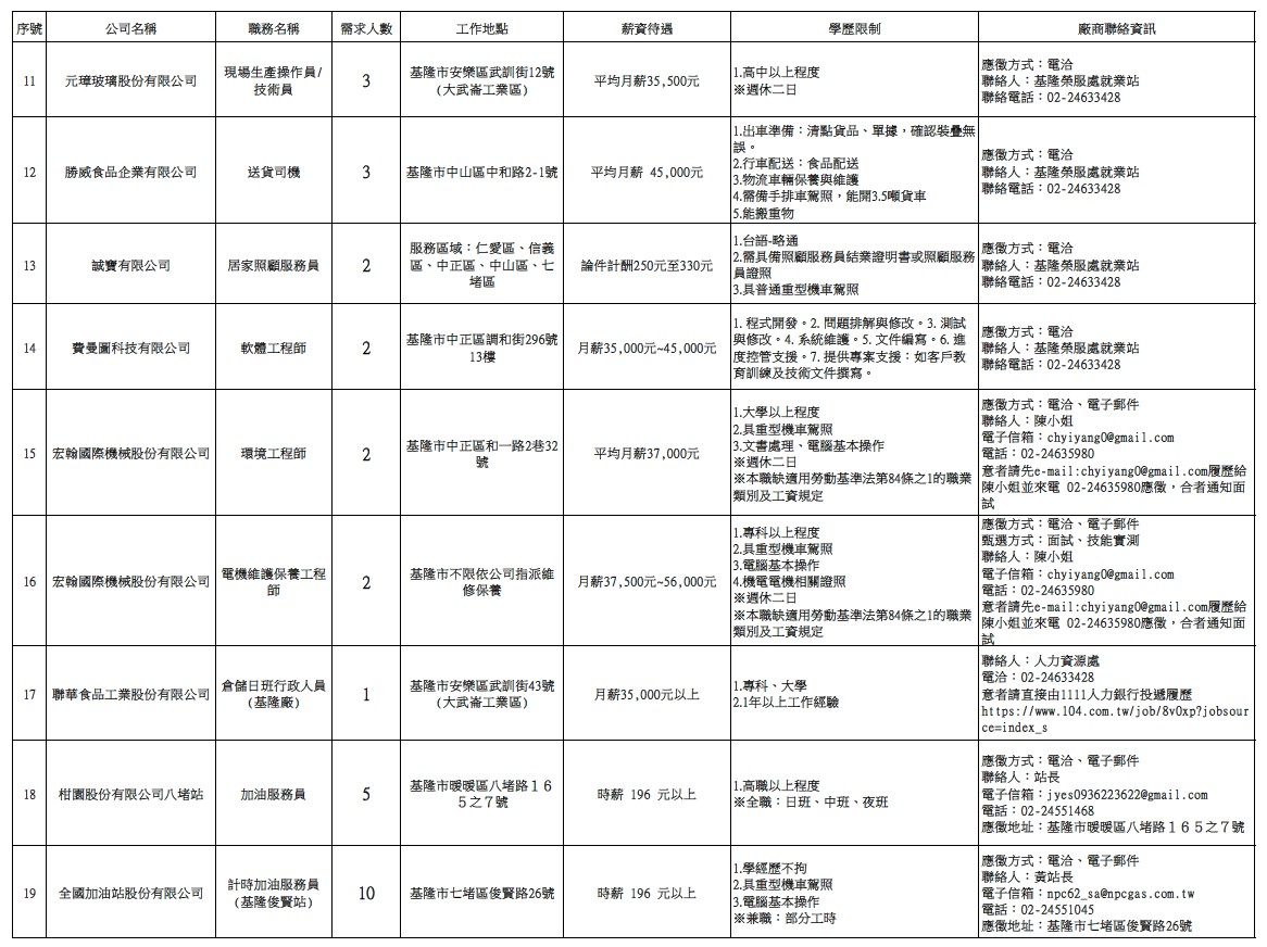 發布日期:114-12-23 資料來源:基隆市榮民服務處 【基隆市榮服處】廠商職缺表(114.12.23)-1 相關照片 【基隆市榮服處】廠商職缺表(114.12.23)-2 【基隆市榮服處】廠商職缺表(114.12.23)-3 【基隆市榮服處】廠商職缺表(114.12.23)-4 【基隆市榮服處】廠商職缺表(114.12.23)-5 【基隆市榮服處】廠商職缺表(114.12.23)-6 【基隆市榮服處】廠商職缺表(114.12.23)-7 附件下載 檔案名稱 更新日期 下載次數 【基隆市榮服處】廠商職缺表(114.12.23).pdf 114-12-23 4