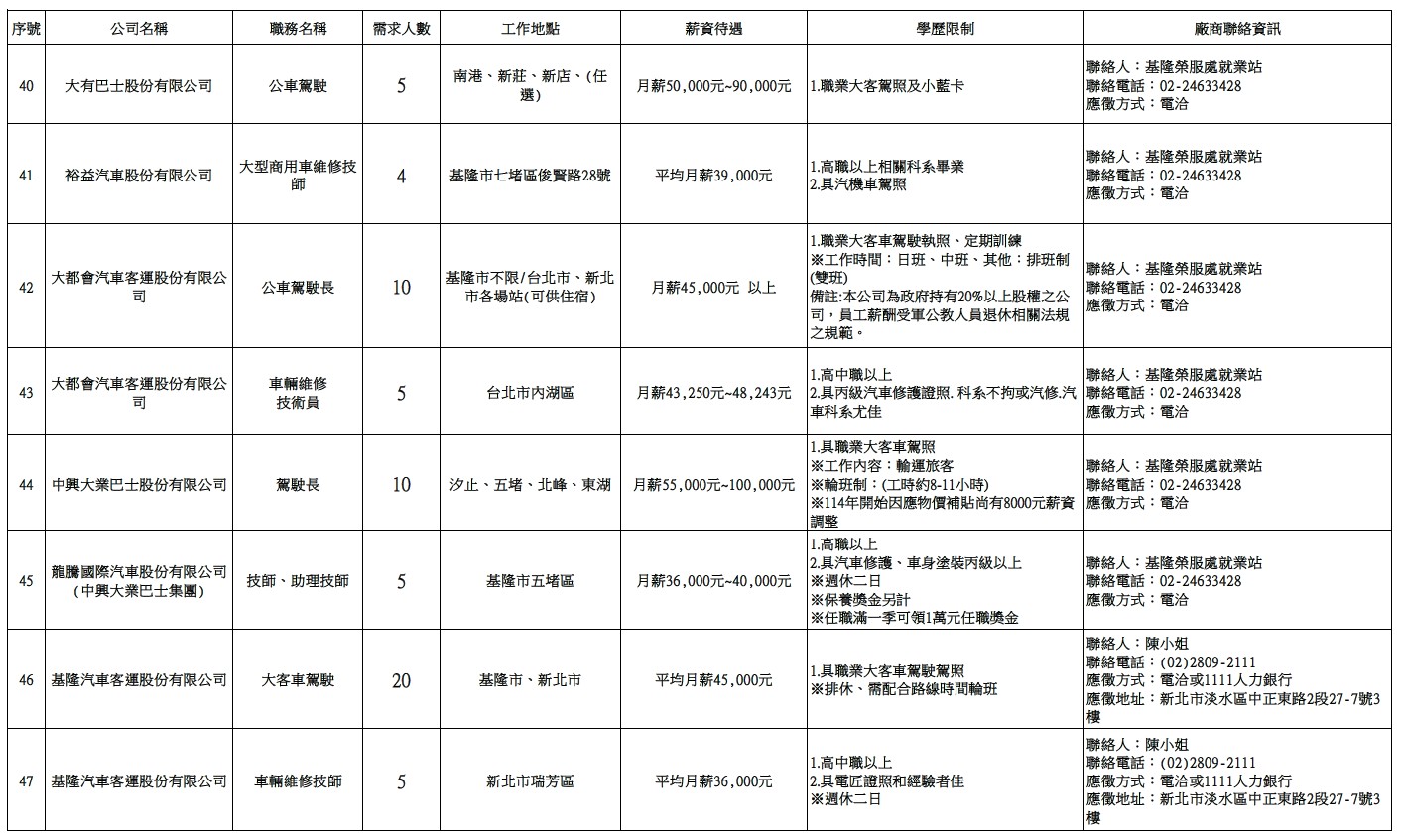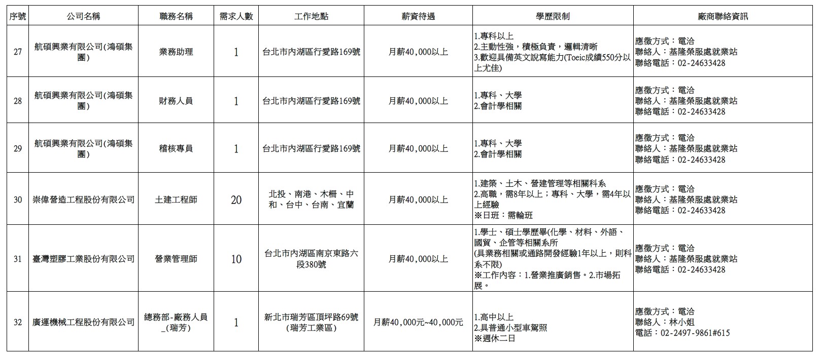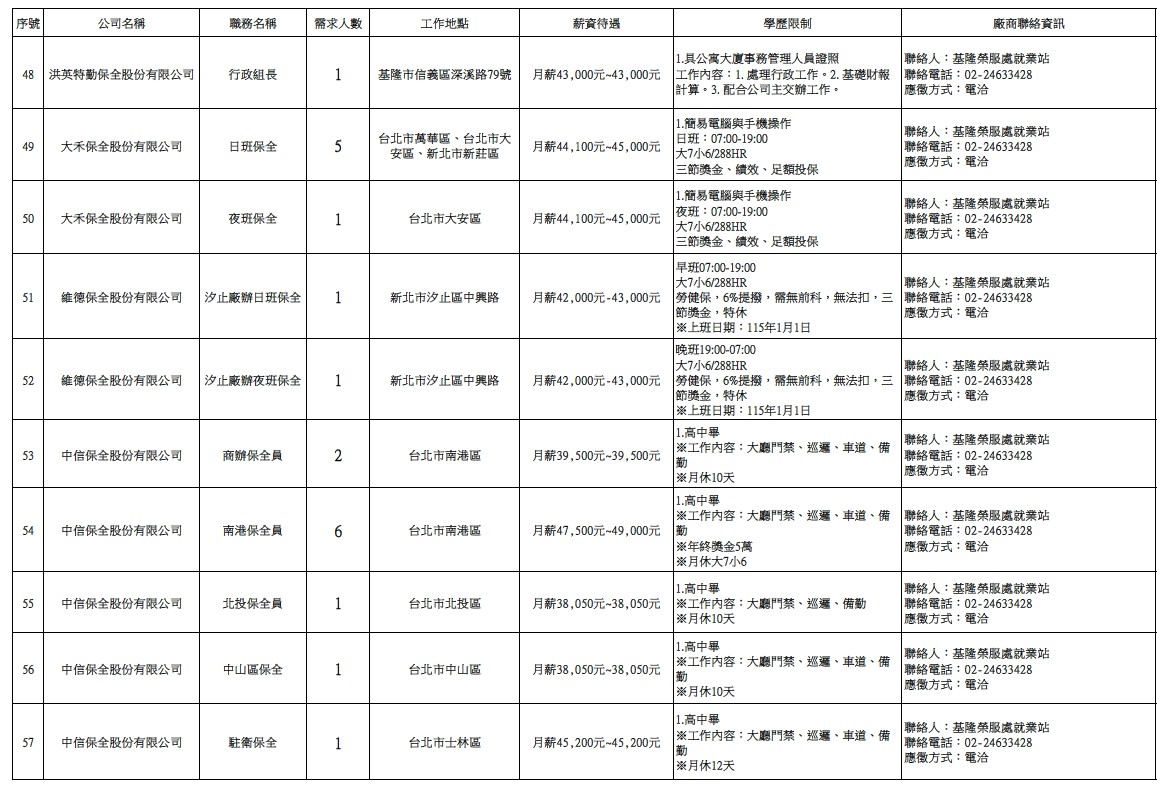 發布日期:114-12-23 資料來源:基隆市榮民服務處 【基隆市榮服處】廠商職缺表(114.12.23)-1 相關照片 【基隆市榮服處】廠商職缺表(114.12.23)-2 【基隆市榮服處】廠商職缺表(114.12.23)-3 【基隆市榮服處】廠商職缺表(114.12.23)-4 【基隆市榮服處】廠商職缺表(114.12.23)-5 【基隆市榮服處】廠商職缺表(114.12.23)-6 【基隆市榮服處】廠商職缺表(114.12.23)-7 附件下載 檔案名稱 更新日期 下載次數 【基隆市榮服處】廠商職缺表(114.12.23).pdf 114-12-23 4