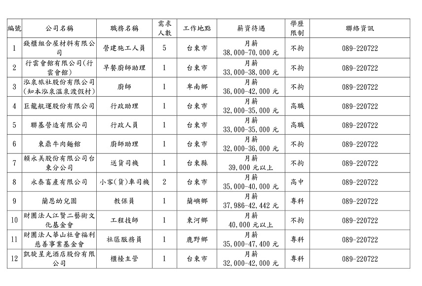 發布日期:114-12-23 資料來源:臺東縣榮民服務處 【臺東榮服處】廠商職缺表_114.12.23 附件下載 檔案名稱 更新日期 下載次數 【臺東榮服處】廠商職缺表_114.12.23.pdf 114-12-23 4