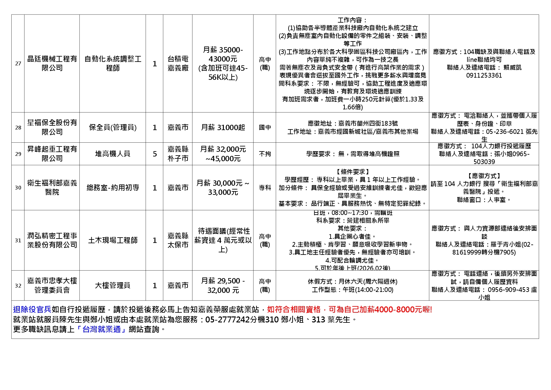 【嘉義榮服處】廠商職缺表(115.01.06)