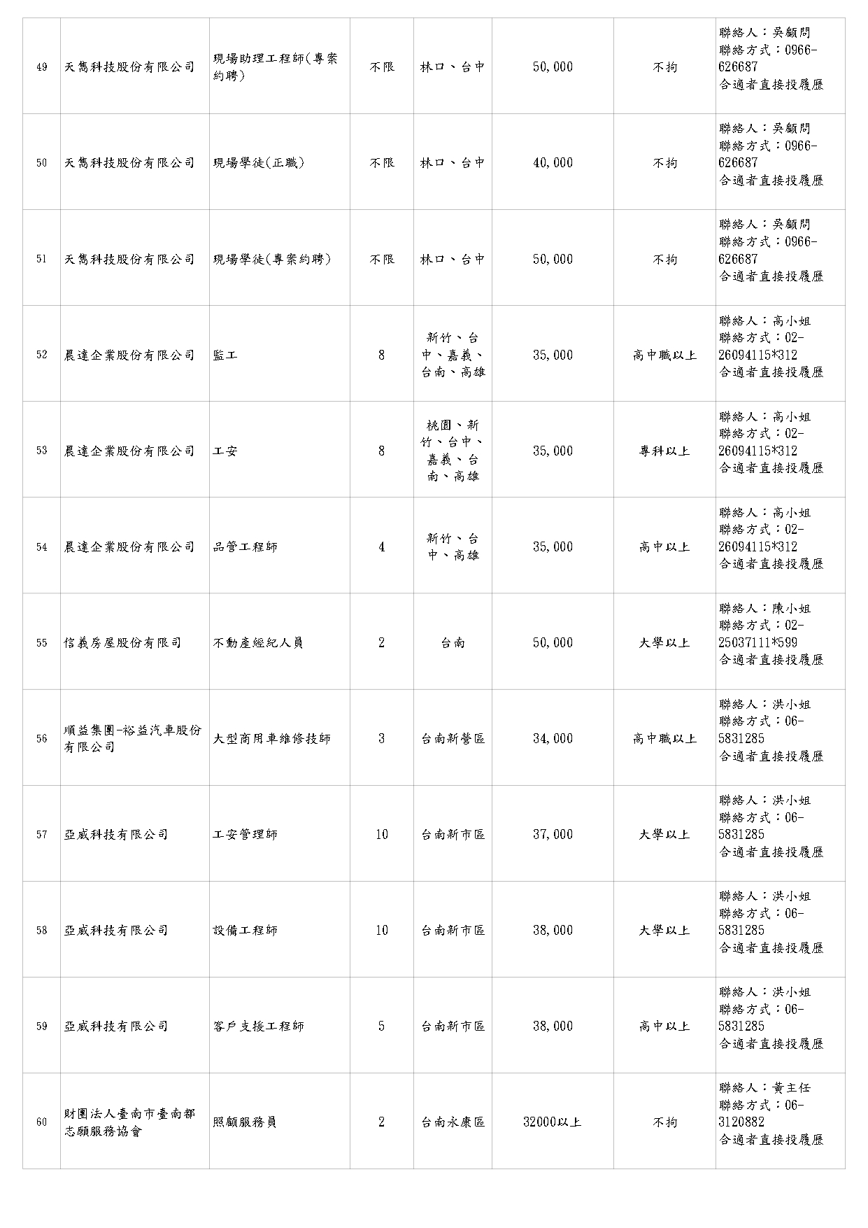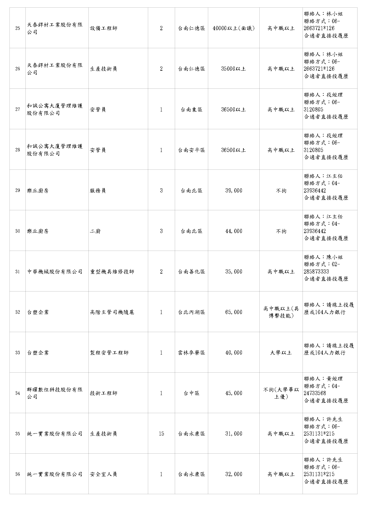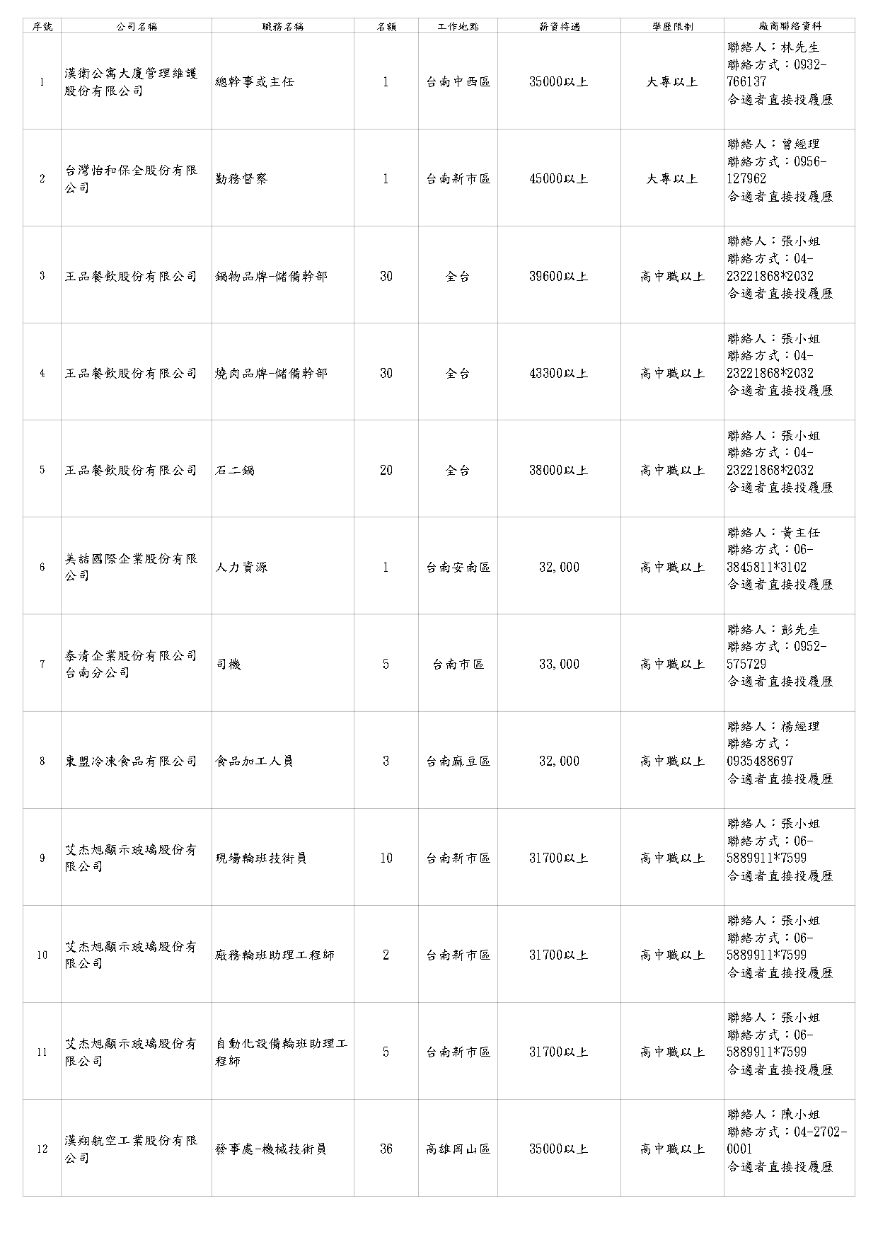【臺南市榮服處】廠商職缺表(115.01.09)