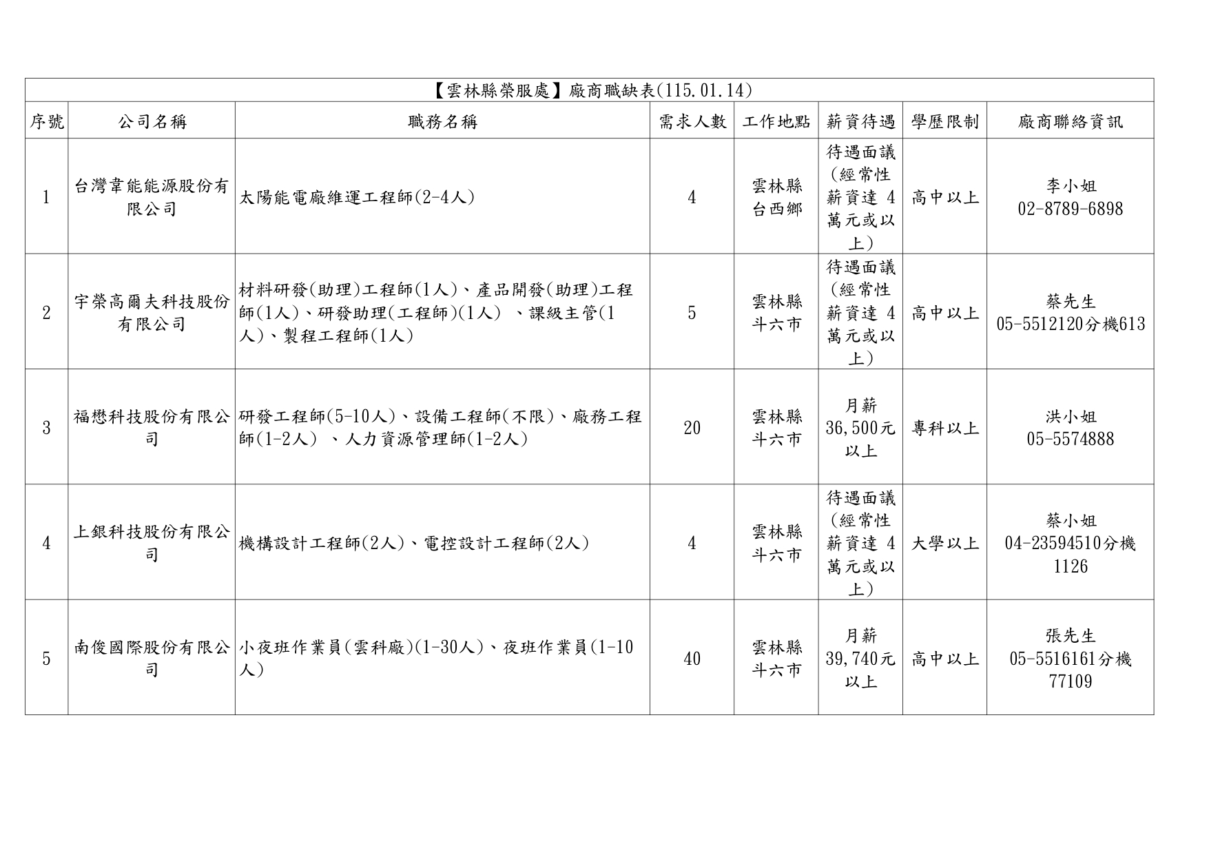 | 【雲林縣榮服處】廠商職缺表(115.01.14)+.pdf | 115-01-14 | 5 |