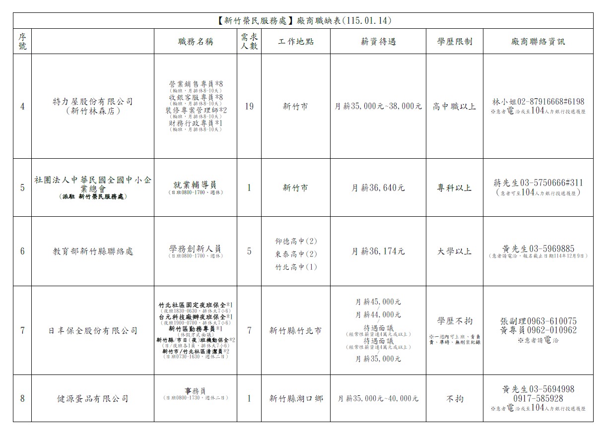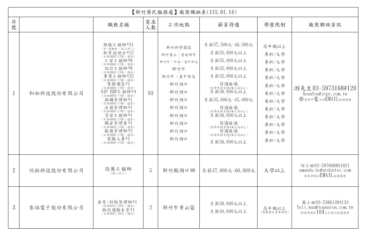 發布日期:115-01-14 資料來源:新竹榮民服務處 新竹榮服處廠商職缺表(115.01.14)【新竹榮服處】廠商職缺表(115.01.14) 相關照片 新竹榮服處廠商職缺表(115.01.14)-1 附件下載 檔案名稱 更新日期 下載次數 新竹榮服處廠商職缺表(115.01.14)--1.pdf 115-01-14 6