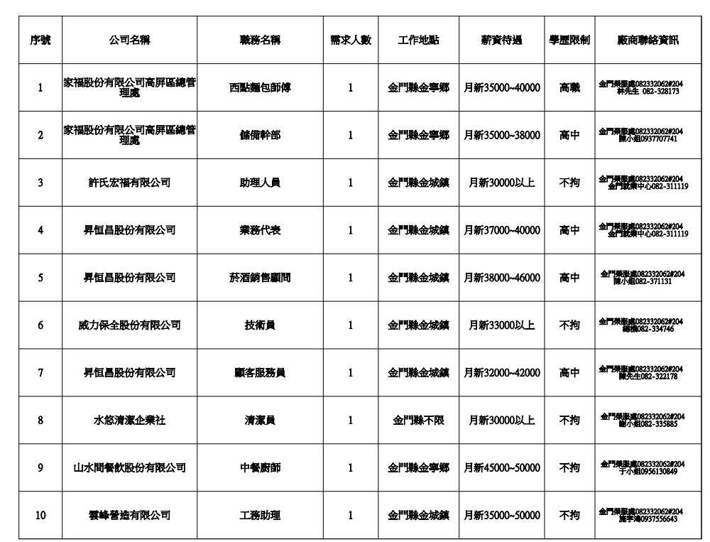 發布日期:115-03-03 資料來源:金門縣榮民服務處 【金門縣榮服處】廠商職缺表(115.03.03) 附件下載 檔案名稱 更新日期 下載次數 【金門縣榮服處】廠商職缺表(115.03.03).pdf 115-03-03 3