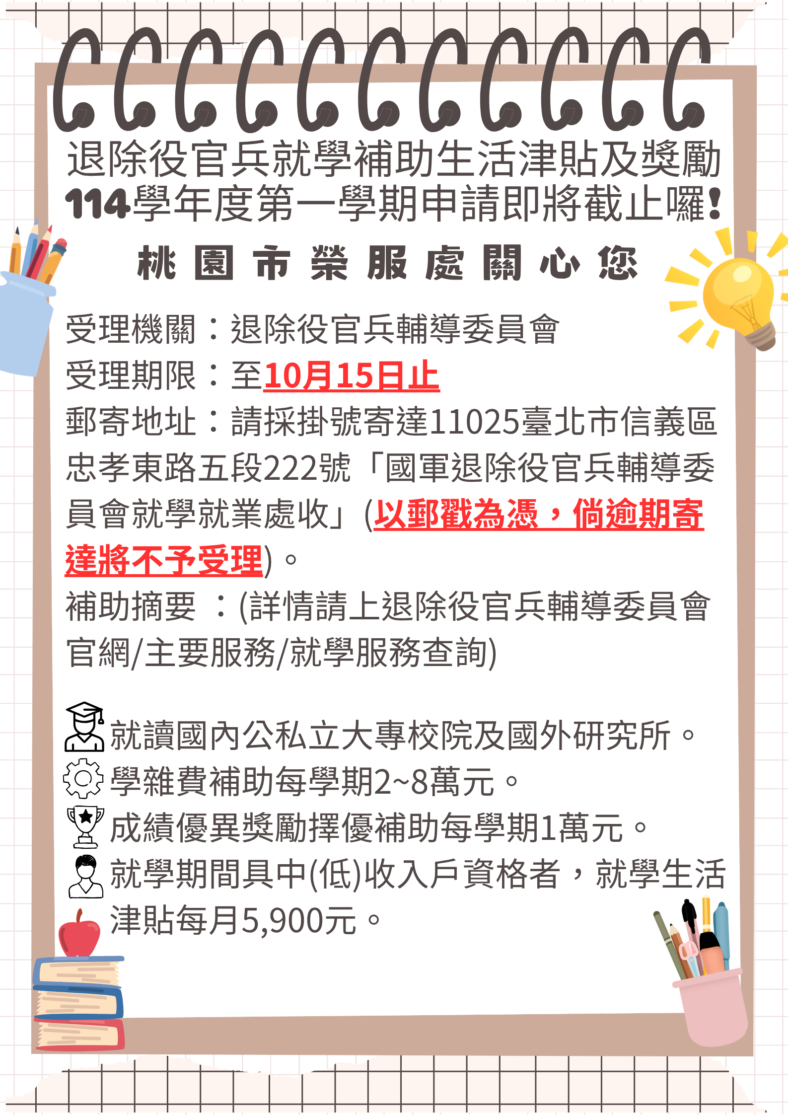 貼心提醒~~114學年度第1學期申請即將截止囉!! **請注意申請期限至10月15日止!! **桃園市榮民服務處諮詢專線03-4375863分機138江先生 就學補助生活津貼及獎勵規定網址~ https://www.vac.gov.tw/cp-1797-3239-1.html
