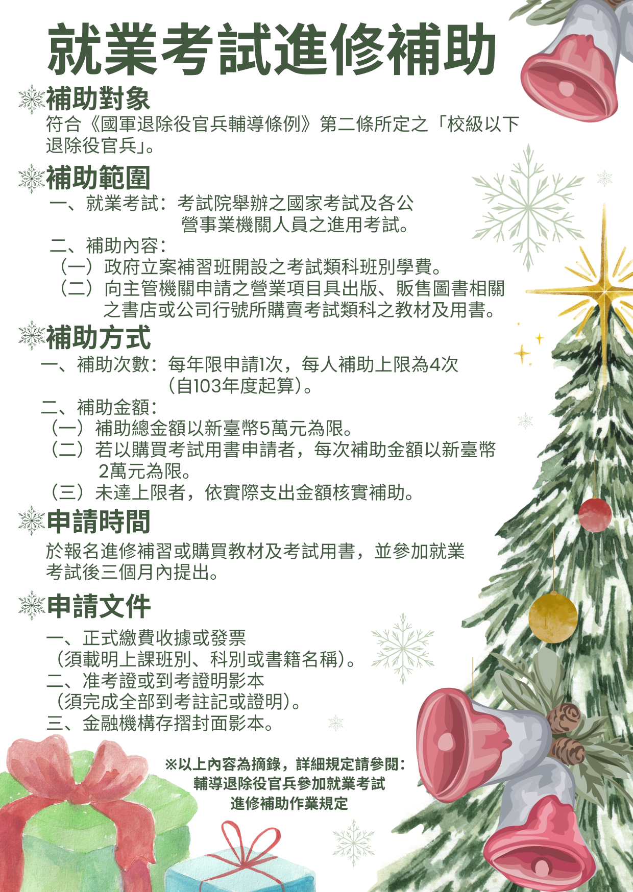桃園市榮民服務處諮詢專線03-4375863分機138江先生 就業考試進修補助規定網址~~ http://law.vac.gov.tw/vaclaw/LawContent.aspx?id=FL030576