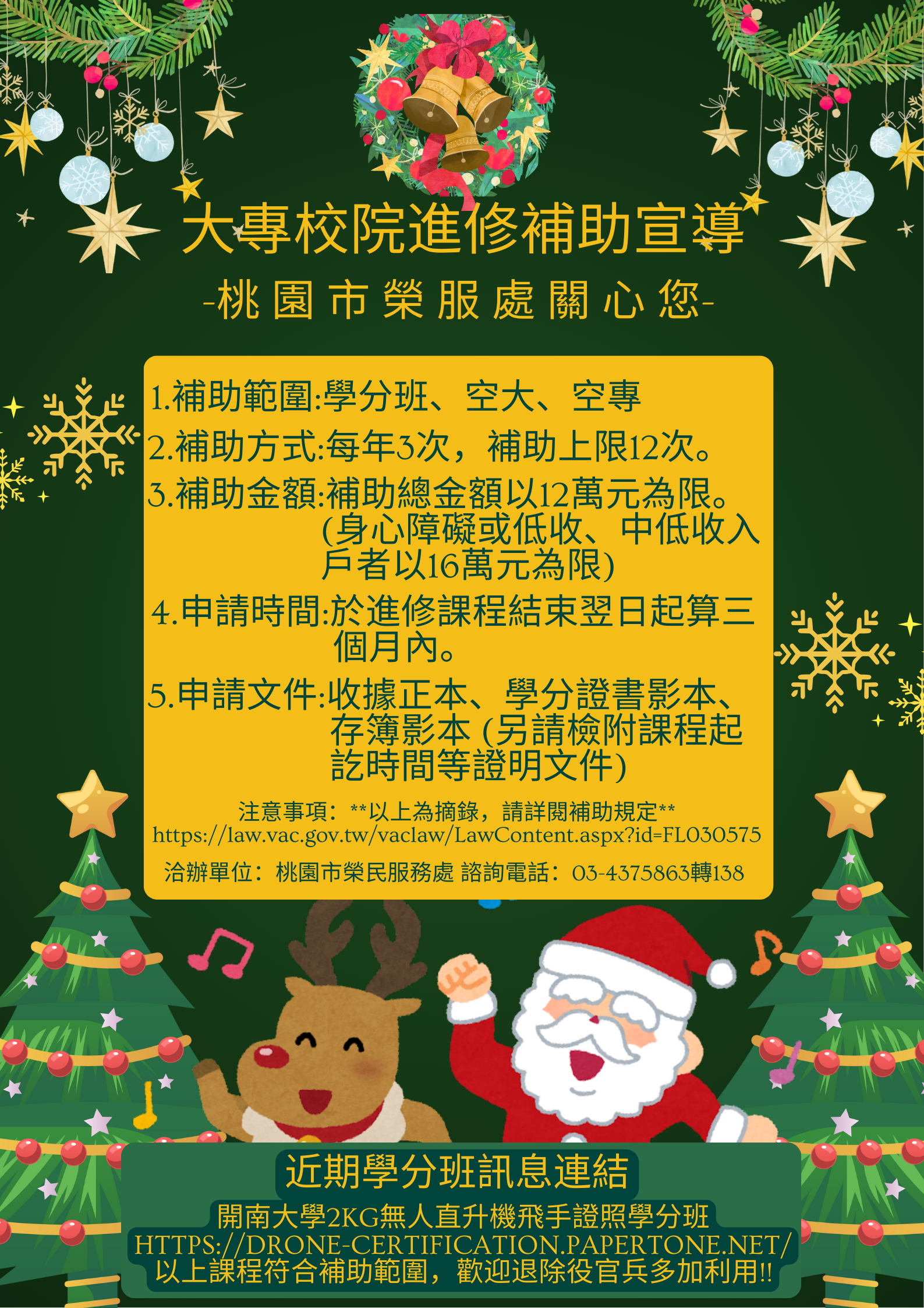桃園市榮民服務處諮詢電話:03-4375863分機138江先生 補助網址~ https://law.vac.gov.tw/vaclaw/LawContent.aspx?id=FL030575 **近期學分班訊息連結~~ 開南大學2KG無人直升機飛手證照學分班: https://drone-certification.papertone.net/ 以上課程符合補助範圍,歡迎退除役官兵多加利用!!