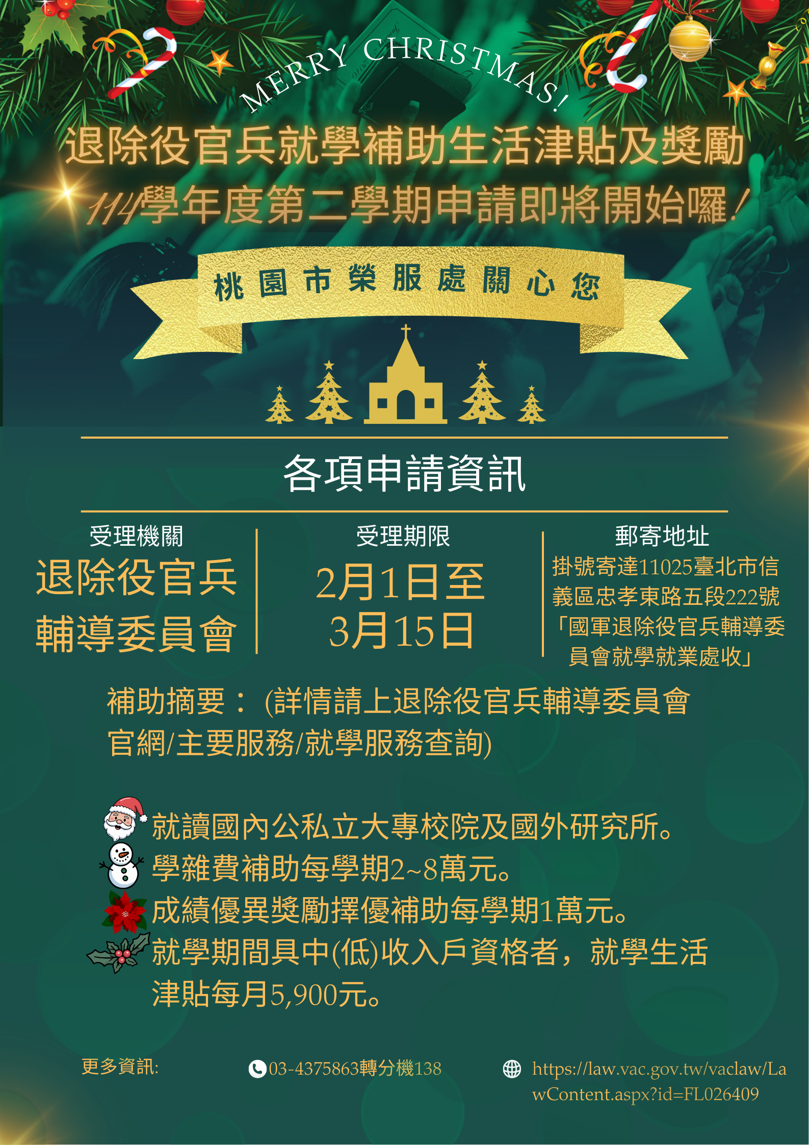 貼心提醒~~114學年度第二學期申請將於115年2月開始!! **請注意申請期限於2月1日至3月15日止!! **桃園市榮民服務處諮詢專線03-4375863分機138江先生 就學補助生活津貼及獎勵規定網址~ https://law.vac.gov.tw/vaclaw/LawContent.aspx?id=FL026409