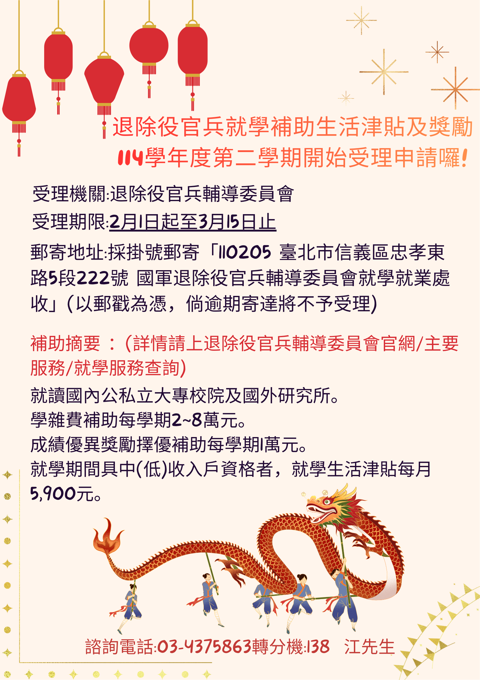 提醒您~~114學年度第二學期申請已於2月1日起開始受理!! **請注意申請期限於115年2月1日起至3月15日止!! **桃園市榮民服務處諮詢專線03-4375863分機138江先生