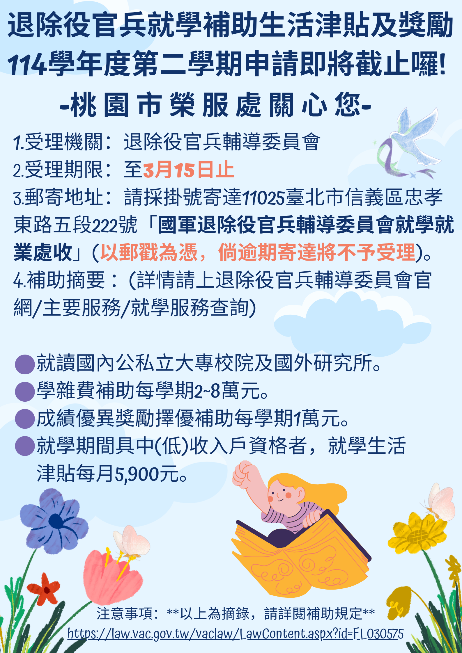 【就學補助生活津貼及獎勵宣導-114學年度第2學期申請即將截止】