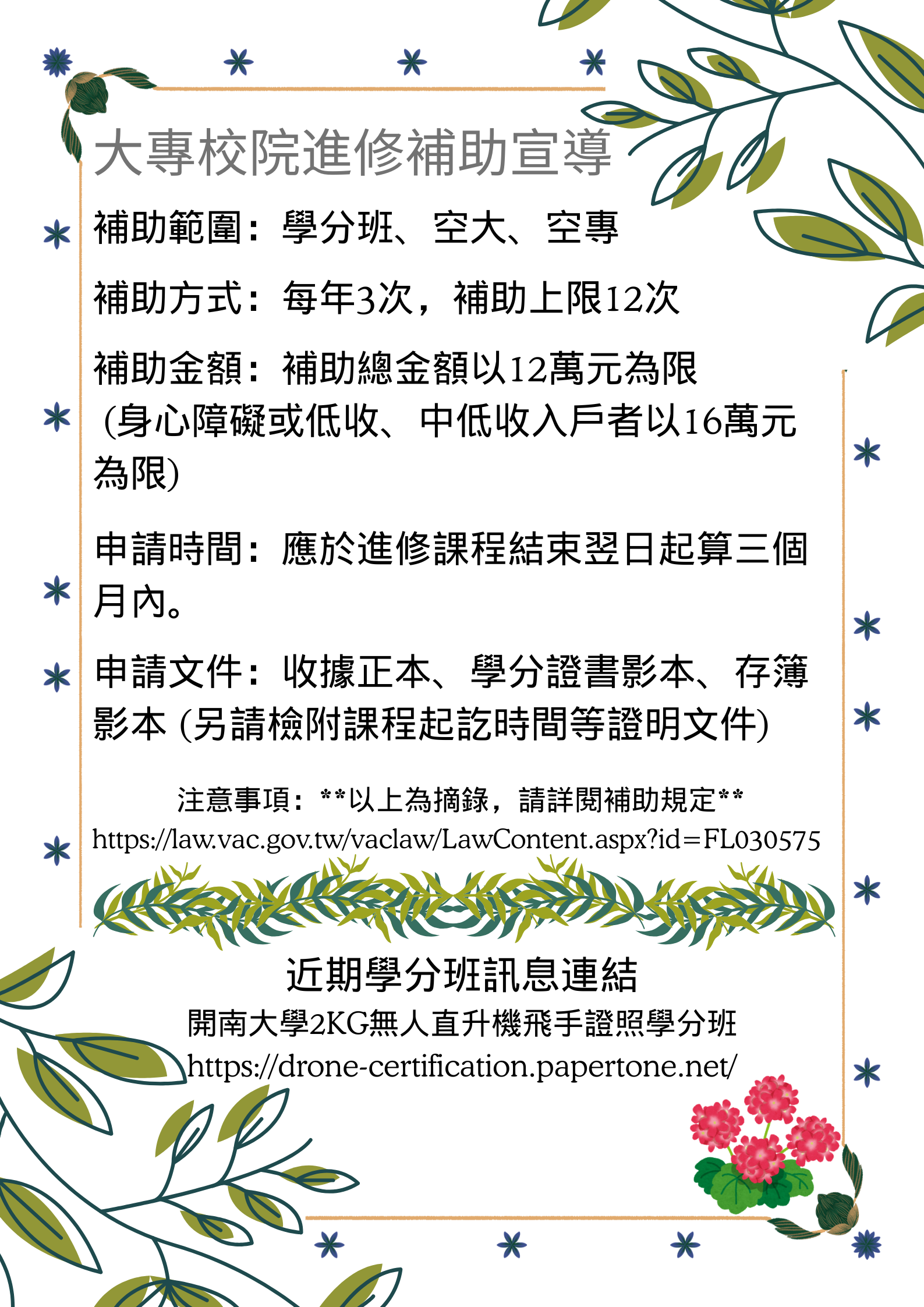 桃園市榮民服務處諮詢電話:03-4375863分機138江先生 補助網址~ https://law.vac.gov.tw/vaclaw/LawContent.aspx?id=FL030575 **近期學分班訊息連結~~ 開南大學2KG無人直升機飛手證照學分班: https://drone-certification.papertone.net/ 以上課程符合補助範圍,歡迎退除役官兵多加利用!!