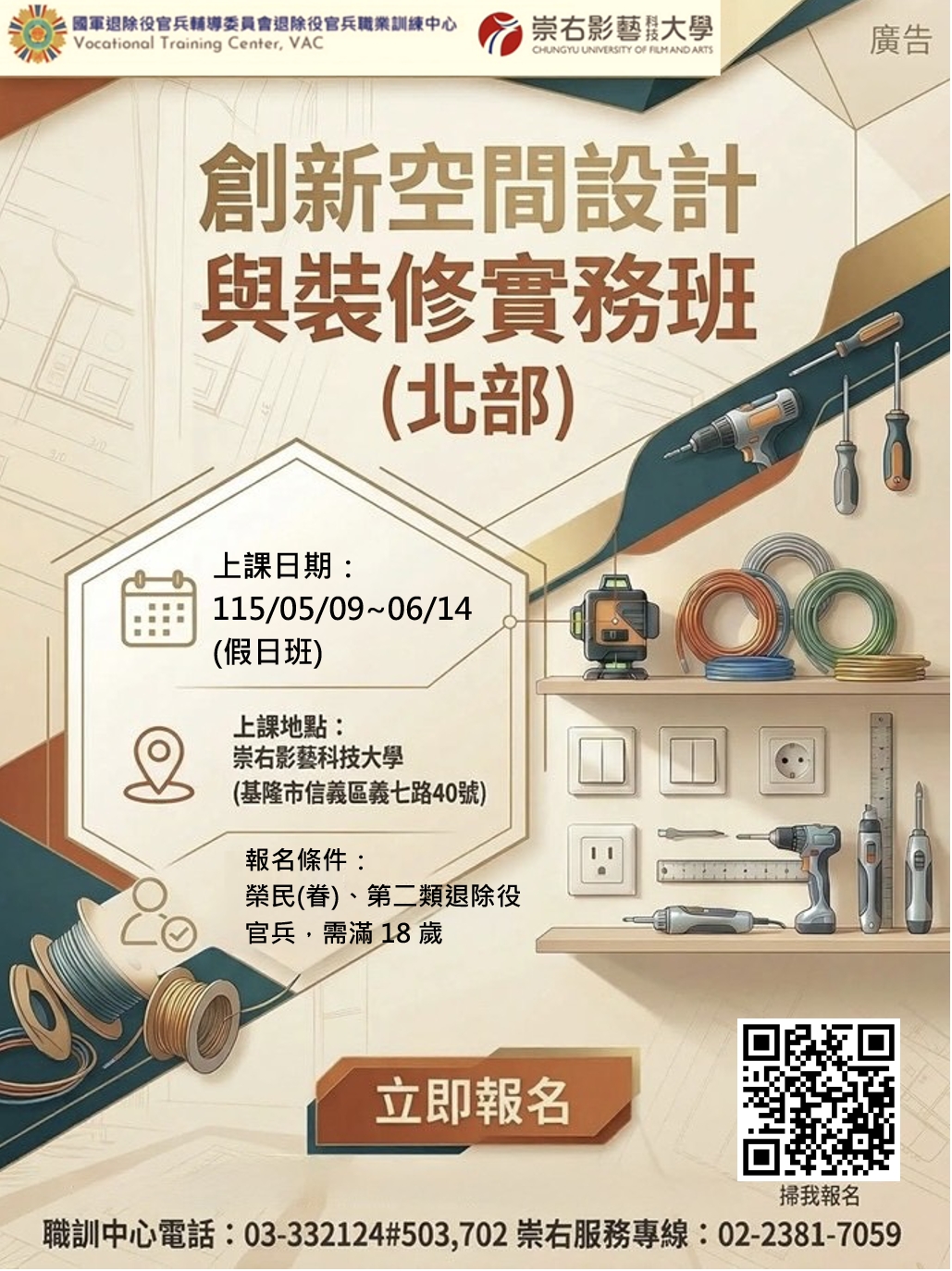 【退輔會職訓中心課程宣導-創新空間設計與裝修實務班(北部)開始報名】