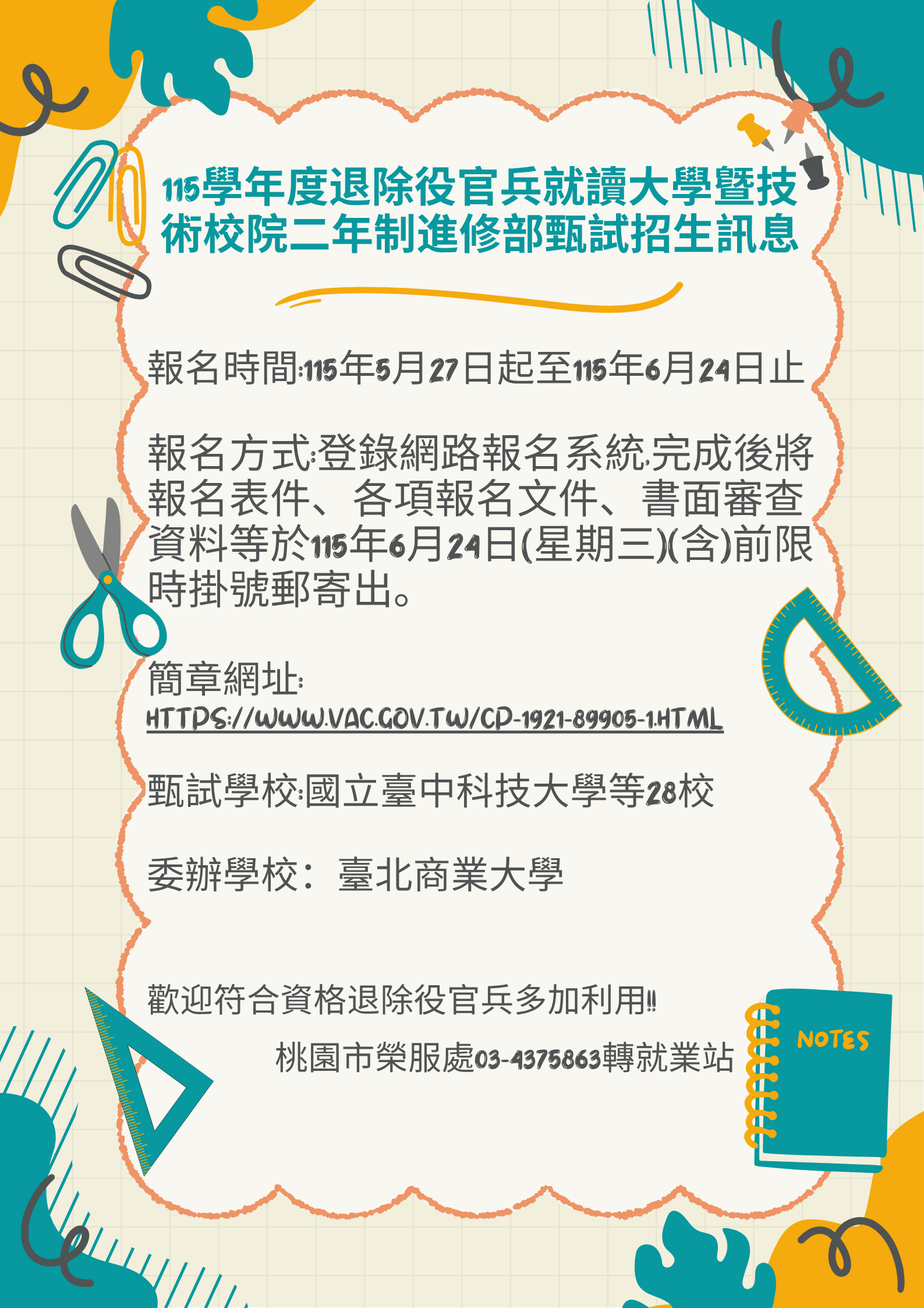 報名資格:具專科或同等學力之退除役官兵 報名時間:115.05.27 〜115.06.24 招生網址:https://vet.ntub.edu.tw 報名方式:網路報名(https://study.ntub.edu.tw/veteran) 招生名額:共273名 合作學校:國立臺中科技大學等28校 委辦學校:臺北商業大學
