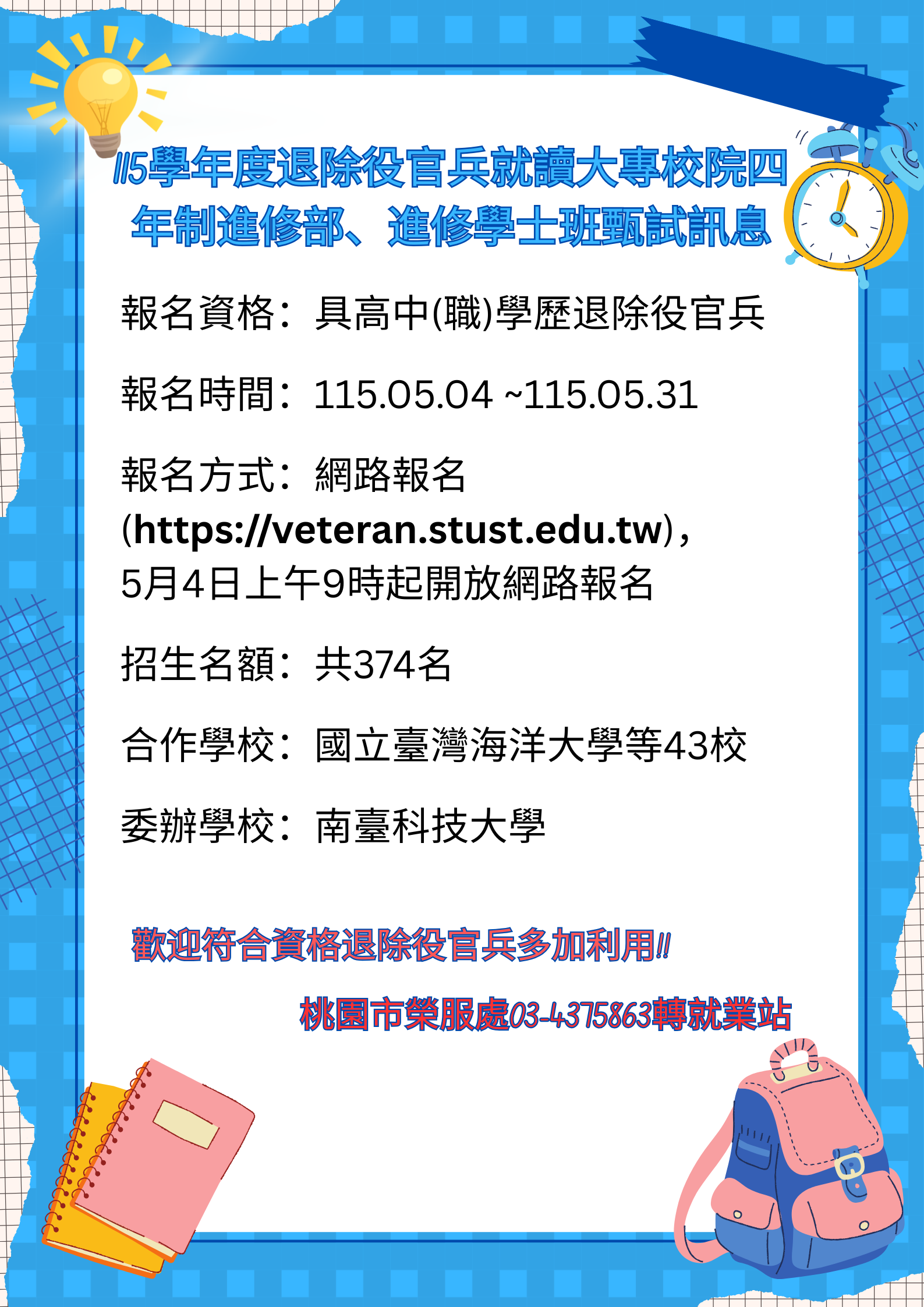 報名資格:具高中(職)學歷退除役官兵 報名時間:115.05.04 ~115.05.31 報名方式:網路報名(https://veteran.stust.edu.tw),5月4日上午9時起開放網路報名 招生名額:共374名 合作學校:國立臺灣海洋大學等43校 委辦學校:南臺科技大學