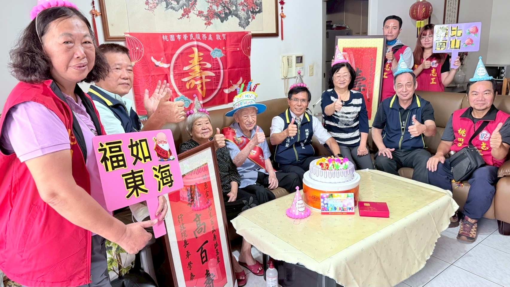桃園市榮民服務處於114年8月14日舉辦百歲榮民胡爺爺祝壽活動,由鄭源敏處長親自率領責任區輔導員、社區服務組長及榮欣志工團隊,並邀請中聖里崔美瑛里長到場祝賀。活動中,鄭處長為胡爺爺披上象徵榮耀的「百歲榮光彩帶」,戴上輔導會嚴德發主委轉贈的金壽桃項鍊,並致贈總統與行政院長頒贈的百歲壽屏,同時代表榮服處全體同仁獻上誠摯祝福卡片,祝賀胡爺爺健康長壽、福壽綿長,現場氣氛溫馨熱烈,掌聲與笑聲交織,洋溢著敬意與喜悅。 胡爺爺民國15年次出生於江蘇省宿遷縣,年少投身軍旅,忠誠服役,隨政府來台後,與夫人相識並結婚,育有二子一女,服役期間擔任財務官,曾隨軍駐紮多地;退役後又於總統府任職直至退休,始終以認真負責的態度完成每項任務。胡爺爺長年在夫人悉心照料下,三餐飲食均衡、生活作息規律;夫人不僅料理家務,更以耐心與關愛相伴,確保胡爺爺生活無虞。胡爺爺每日到公園甩手或散步鍛鍊體力,平日喜愛閱讀報紙、書籍與練書法,以文字陶冶心性,雖年逾百歲仍精神奕奕、思路清晰。 鄭源敏處長表示,看到胡爺爺與夫人相守數十載、彼此照顧,深感動容,這份長情不僅是婚姻的典範,更是健康長壽的重要基石。並強調,今日的祝壽活動不僅是慶賀榮民百歲壽辰,更是對世代傳承與堅毅精神的致敬。榮服處將持續關懷榮民長輩,讓他們在社會各界的支持下安享幸福晚年,也讓更多人看見榮民在國家歷史與社會發展中的重要地位。
