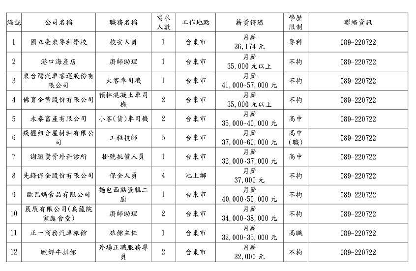 發布日期:114-10-15 資料來源:臺東縣榮民服務處 【臺東榮服處】廠商職缺表_114.10.15 附件下載 檔案名稱 更新日期 下載次數 【臺東榮服處】廠商職缺表_114.10.15.pdf 114-10-15 6