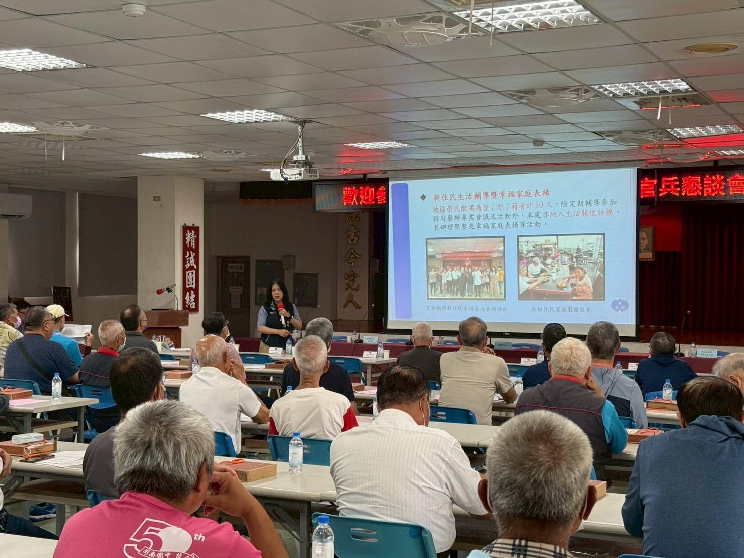 懇談會首先由林玉彩副處長簡報榮服處針對榮民(眷) 就學、就業、就醫、就學、服務照顧及退除給付各項服務作法及成果,就榮民(眷)關切權益逐一宣導說明;接著由縣政府薛宏欣消保官以結合實際案例分享消費者保護的法令宣導,增進榮民袍澤確保財產安全、防範金融詐騙情事。