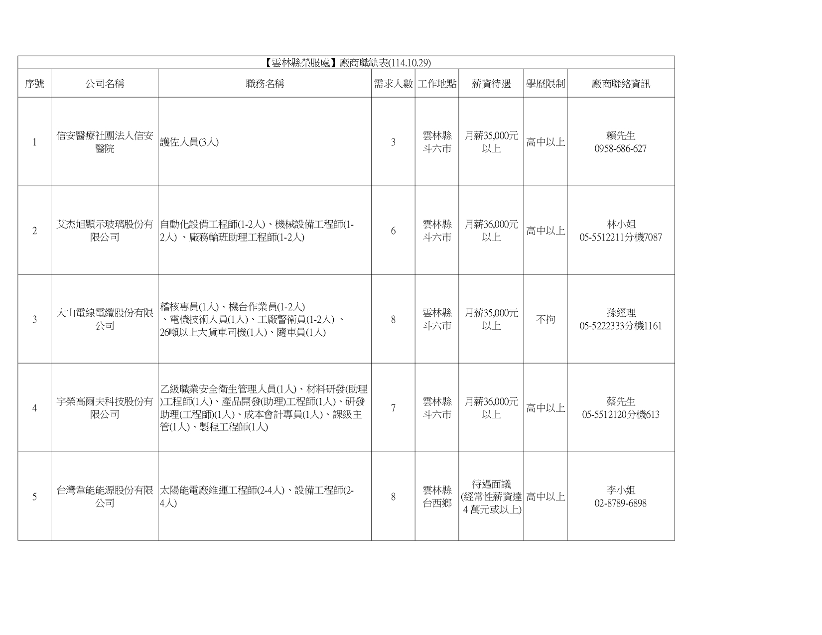 | 【雲林縣榮服處】廠商職缺表(114.10.29)+.pdf | 114-10-29 | 2 |