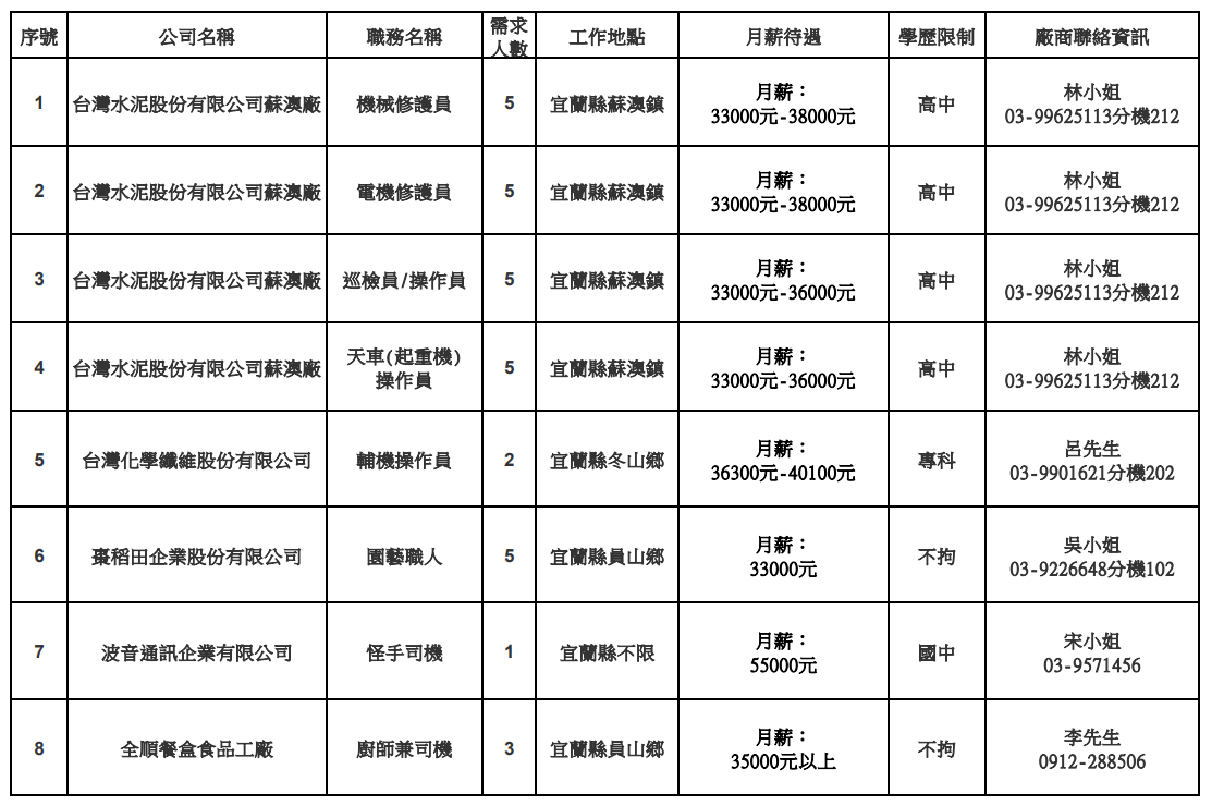 發布日期:114-11-27 資料來源:宜蘭縣榮民服務處 【宜蘭縣榮服處】廠商職缺表(114.12.01) 附件下載 檔案名稱 更新日期 下載次數 【宜蘭縣榮服處】廠商職缺表(114.12.01).pdf 114-11-27 1