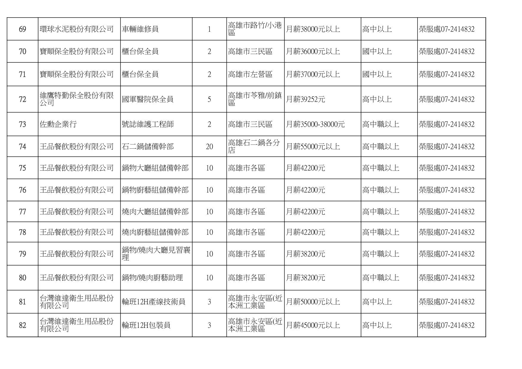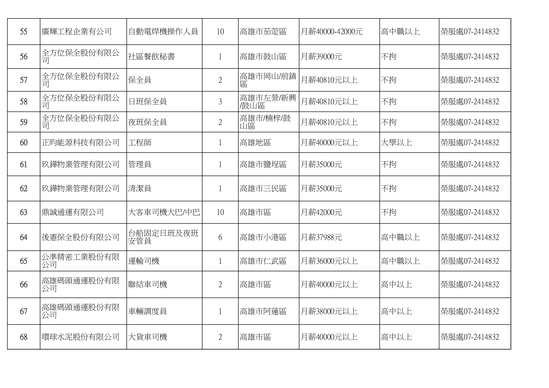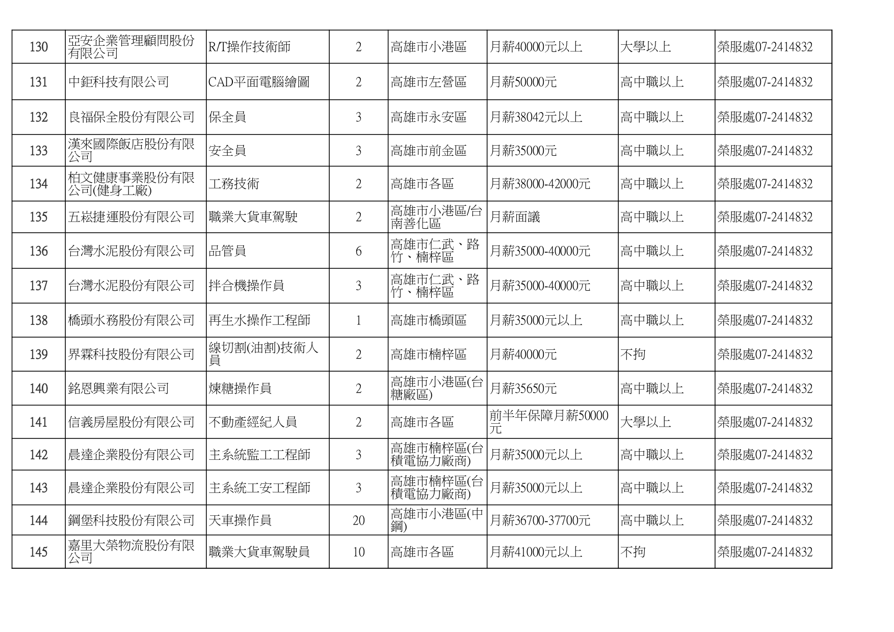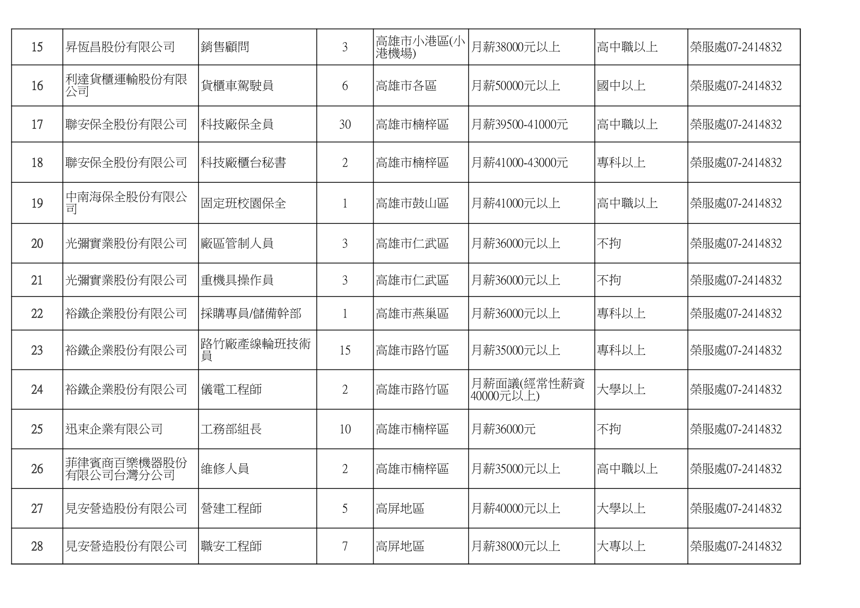 發布日期:115-04-16 資料來源:高雄市榮民服務處 高雄榮服處-廠商職缺列表115.4.16_page-0001有就業需求之退除役官兵,請把握機會! 如有就(轉)業需求,歡迎洽詢本處就業站(07-2414832) 相關照片 高雄榮服處-廠商職缺列表115.4.16_page-0002 高雄榮服處-廠商職缺列表115.4.16_page-0003 高雄榮服處-廠商職缺列表115.4.16_page-0004 高雄榮服處-廠商職缺列表115.4.16_page-0005 高雄榮服處-廠商職缺列表115.4.16_page-0006 高雄榮服處-廠商職缺列表115.4.16_page-0007 高雄榮服處-廠商職缺列表115.4.16_page-0008 高雄榮服處-廠商職缺列表115.4.16_page-0009 高雄榮服處-廠商職缺列表115.4.16_page-0010 高雄榮服處-廠商職缺列表115.4.16_page-0011 高雄榮服處-廠商職缺列表115.4.16_page-0012 附件下載 檔案名稱 更新日期 下載次數 高雄榮服處-廠商職缺列表115.4.16.pdf 115-04-16 6