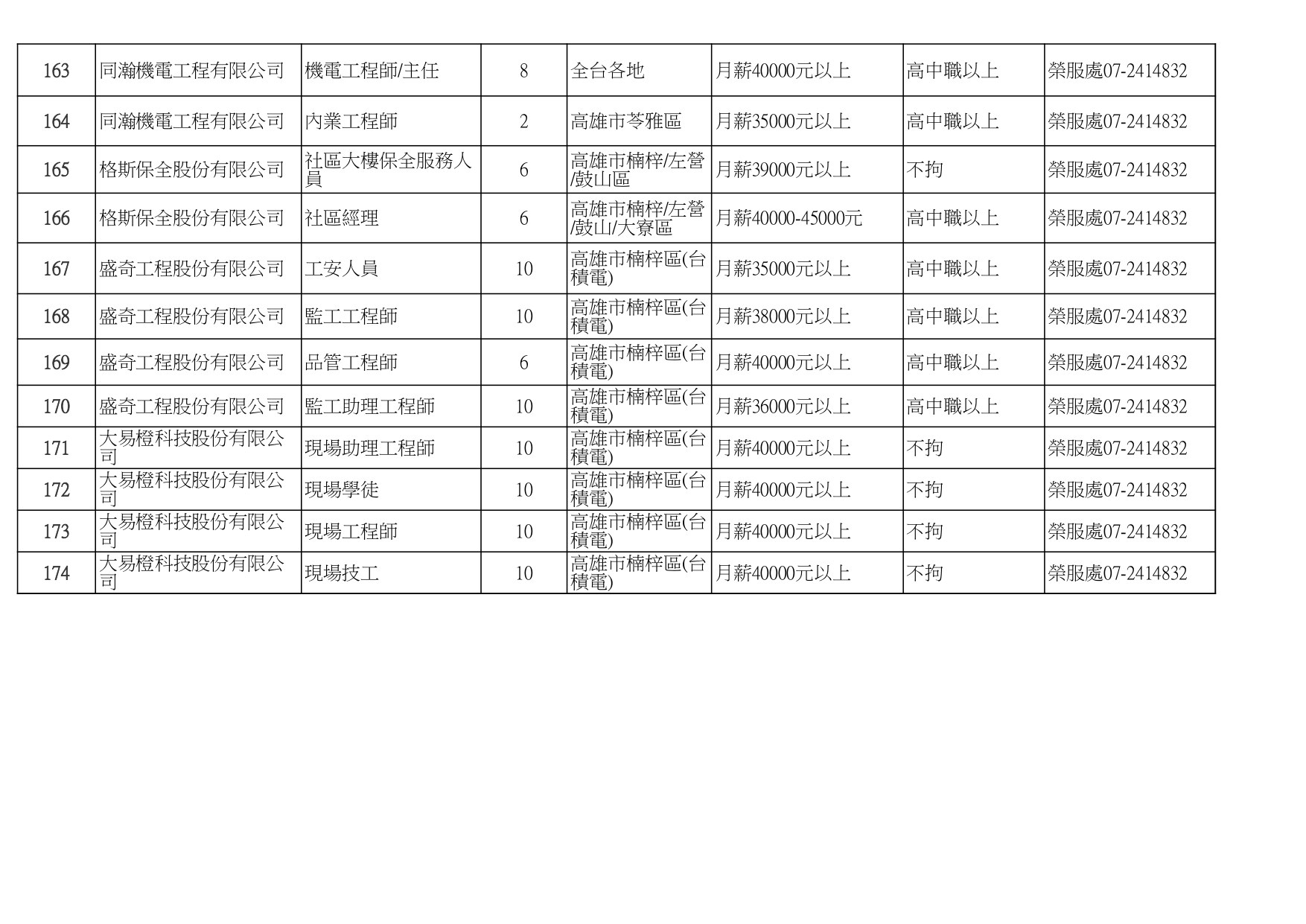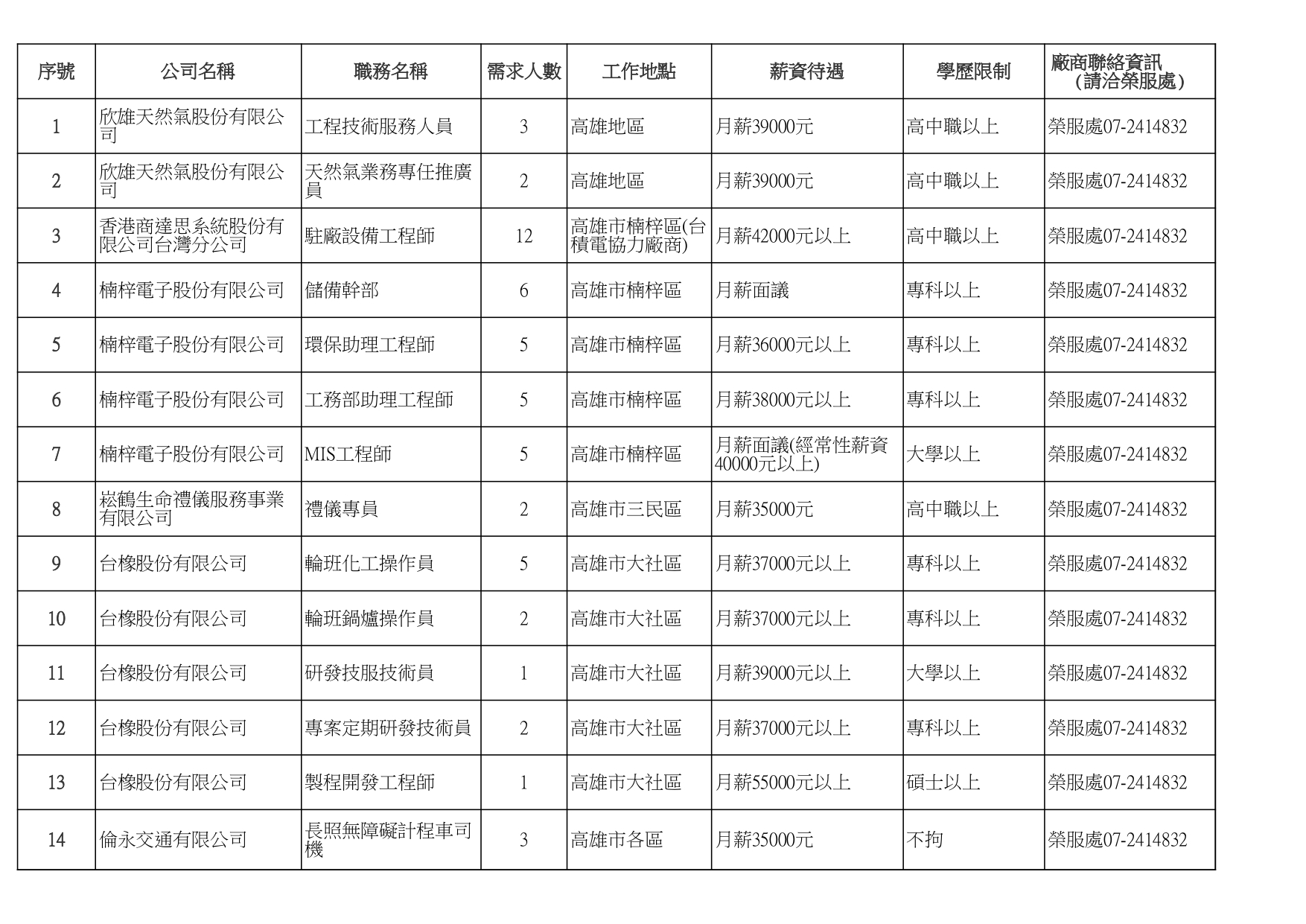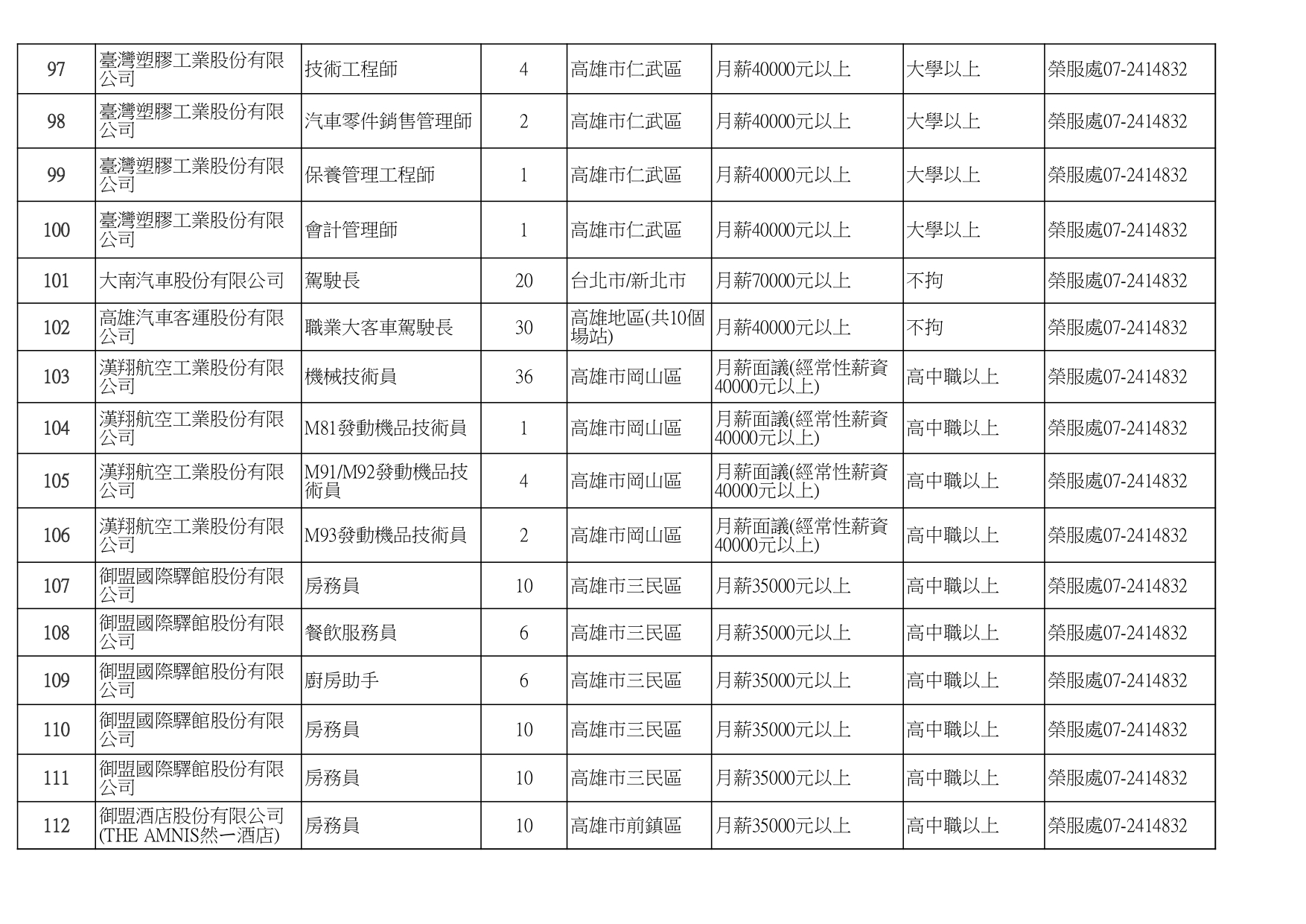 發布日期:115-04-16 資料來源:高雄市榮民服務處 高雄榮服處-廠商職缺列表115.4.16_page-0001有就業需求之退除役官兵,請把握機會! 如有就(轉)業需求,歡迎洽詢本處就業站(07-2414832) 相關照片 高雄榮服處-廠商職缺列表115.4.16_page-0002 高雄榮服處-廠商職缺列表115.4.16_page-0003 高雄榮服處-廠商職缺列表115.4.16_page-0004 高雄榮服處-廠商職缺列表115.4.16_page-0005 高雄榮服處-廠商職缺列表115.4.16_page-0006 高雄榮服處-廠商職缺列表115.4.16_page-0007 高雄榮服處-廠商職缺列表115.4.16_page-0008 高雄榮服處-廠商職缺列表115.4.16_page-0009 高雄榮服處-廠商職缺列表115.4.16_page-0010 高雄榮服處-廠商職缺列表115.4.16_page-0011 高雄榮服處-廠商職缺列表115.4.16_page-0012 附件下載 檔案名稱 更新日期 下載次數 高雄榮服處-廠商職缺列表115.4.16.pdf 115-04-16 6