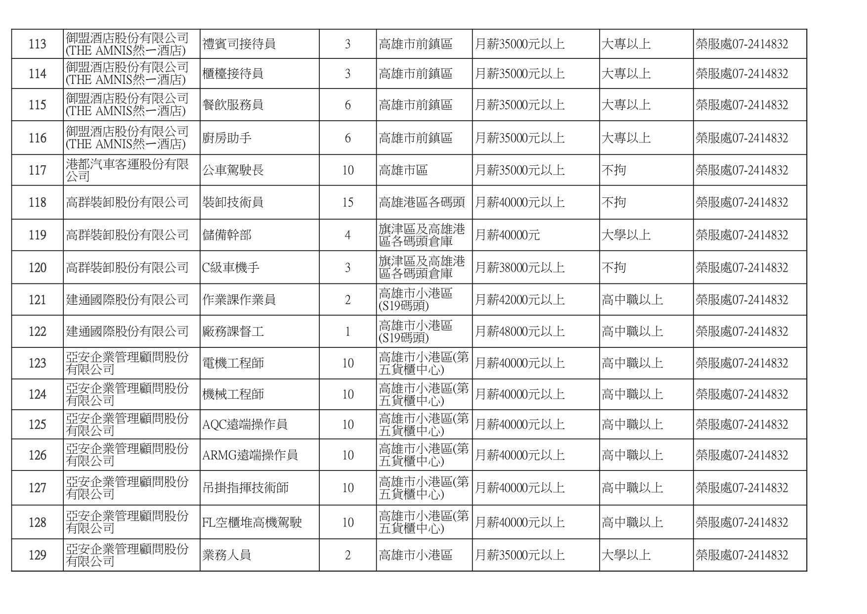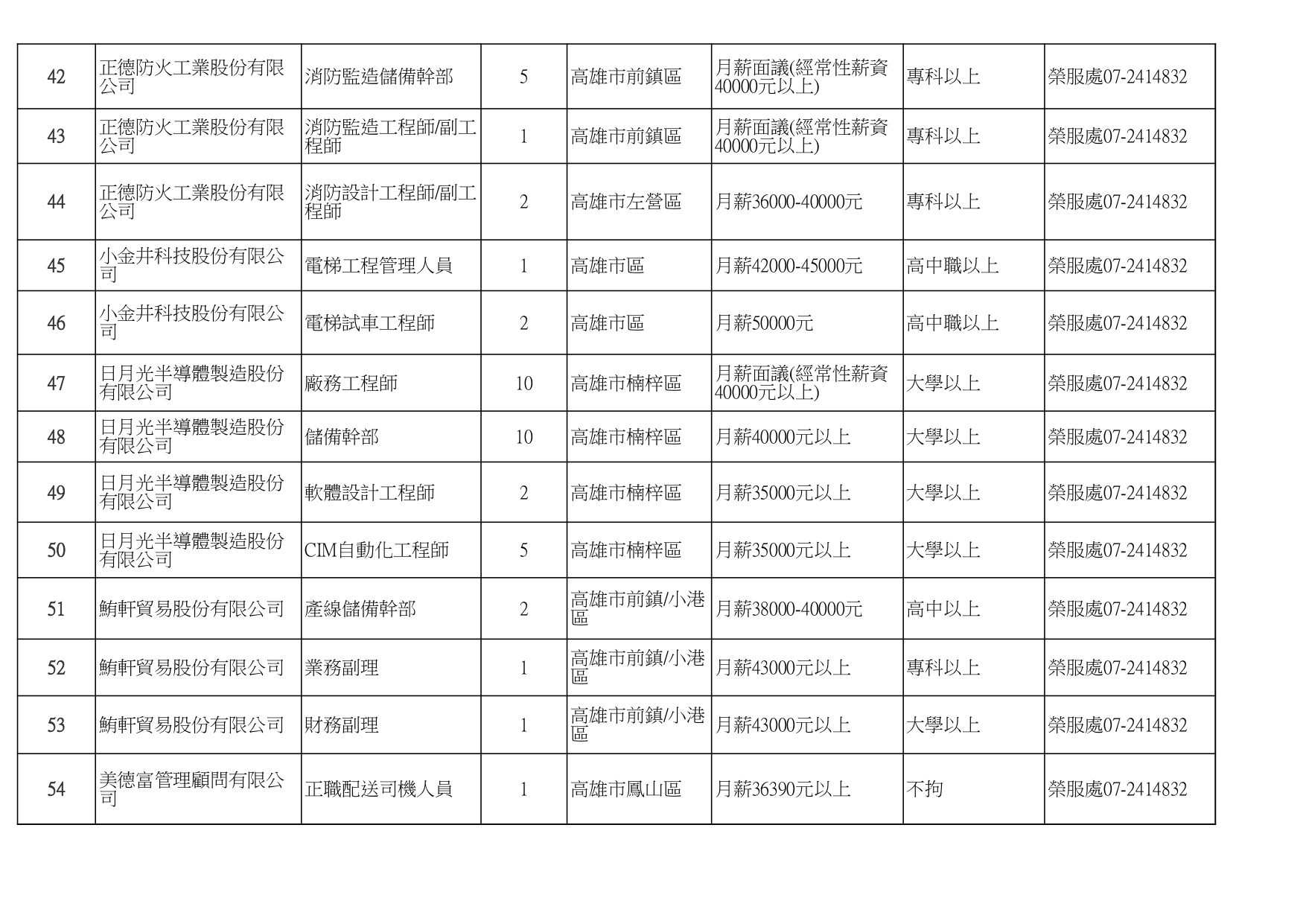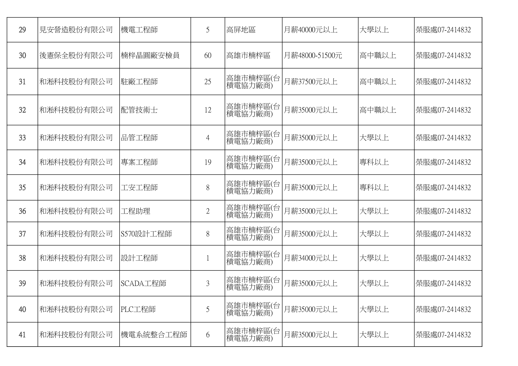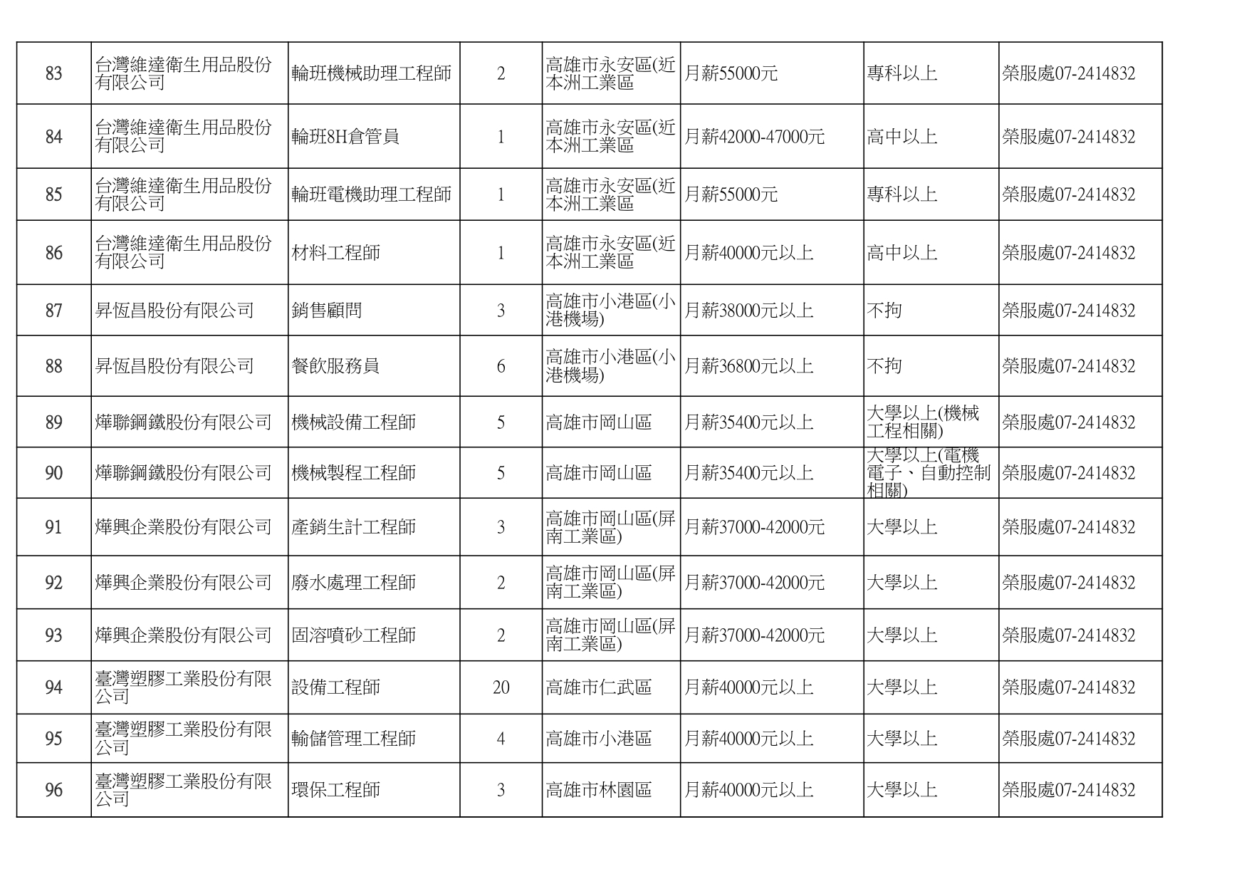 發布日期:115-04-16 資料來源:高雄市榮民服務處 高雄榮服處-廠商職缺列表115.4.16_page-0001有就業需求之退除役官兵,請把握機會! 如有就(轉)業需求,歡迎洽詢本處就業站(07-2414832) 相關照片 高雄榮服處-廠商職缺列表115.4.16_page-0002 高雄榮服處-廠商職缺列表115.4.16_page-0003 高雄榮服處-廠商職缺列表115.4.16_page-0004 高雄榮服處-廠商職缺列表115.4.16_page-0005 高雄榮服處-廠商職缺列表115.4.16_page-0006 高雄榮服處-廠商職缺列表115.4.16_page-0007 高雄榮服處-廠商職缺列表115.4.16_page-0008 高雄榮服處-廠商職缺列表115.4.16_page-0009 高雄榮服處-廠商職缺列表115.4.16_page-0010 高雄榮服處-廠商職缺列表115.4.16_page-0011 高雄榮服處-廠商職缺列表115.4.16_page-0012 附件下載 檔案名稱 更新日期 下載次數 高雄榮服處-廠商職缺列表115.4.16.pdf 115-04-16 6