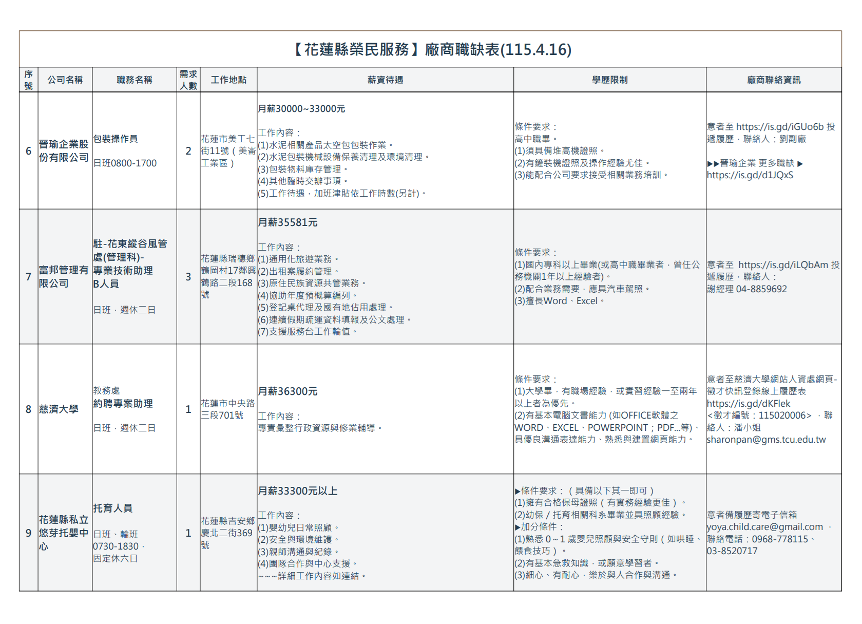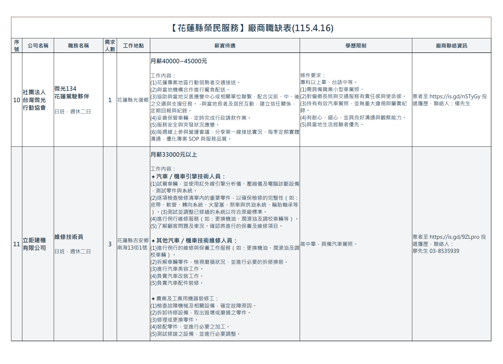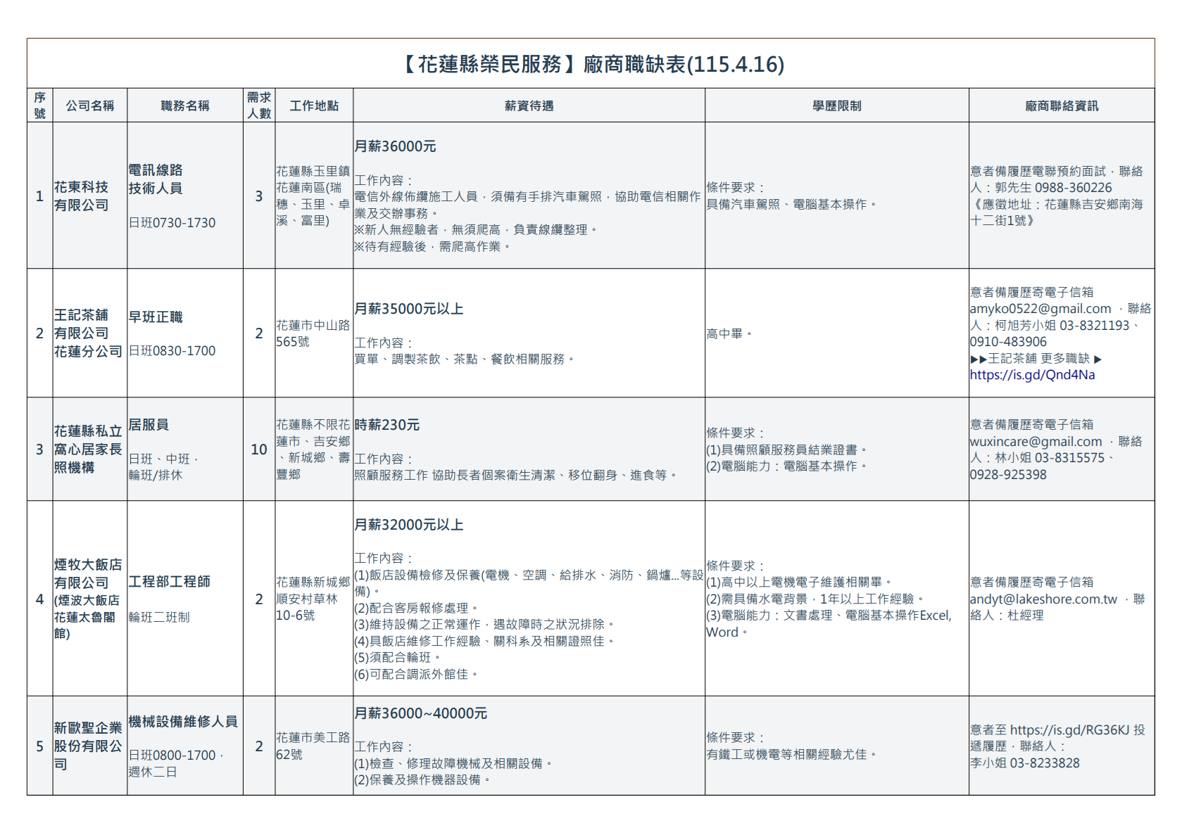 | 【花蓮縣榮民服務處】廠商職缺表(115.4.16).pdf | 115-04-16 | 2 |