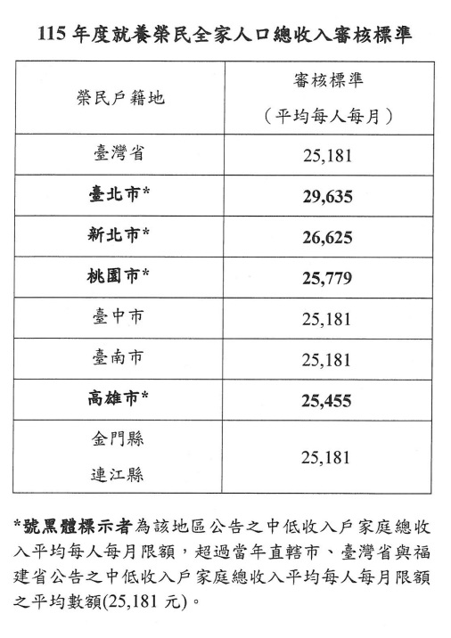輔導會115年度就養榮民全家人口總收入審核標準(輔養字第1142000798號函)