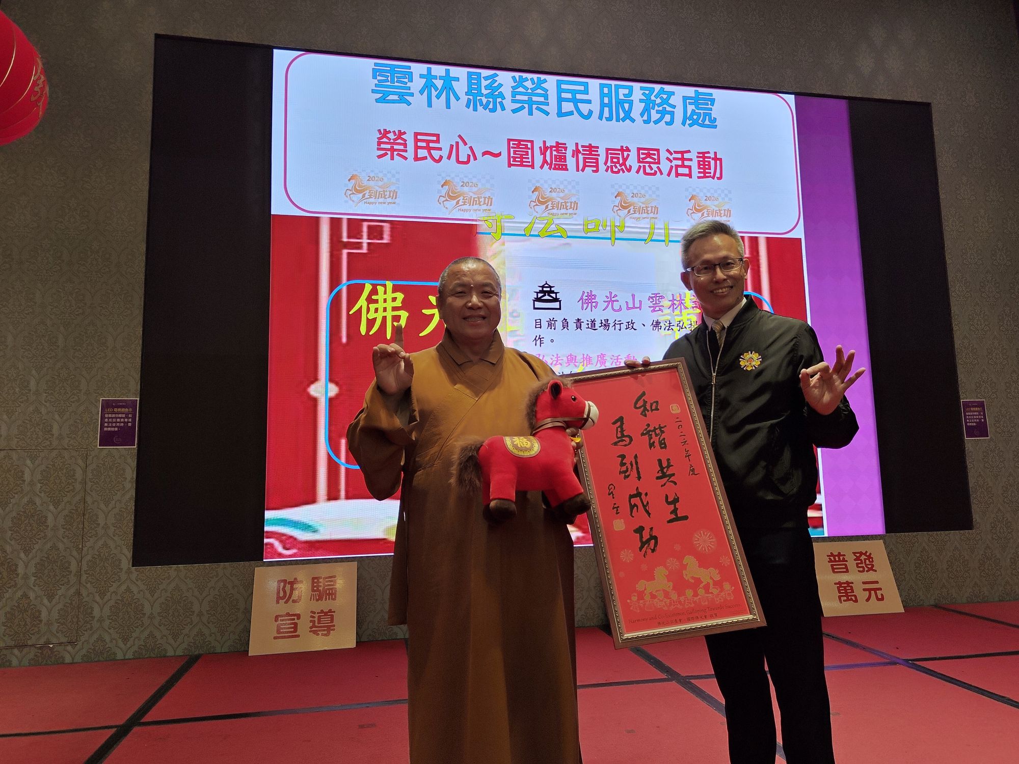 雲林縣榮民服務處日前辦理「榮民心圍爐情感恩餐會」,特別邀請百歲榮民、因公受傷榮民、高齡榮民及縣內退伍軍人社團代表近300人共襄盛舉,並有財團法人榮民眷基金會、欣欣客運公司、欣欣大眾市場公司、欣雲、欣湖、欣桃、欣中、欣林、欣泰天然氣等公司、以及天主教福安醫院、雪中送炭關懷協會及雲林縣中央軍事院校校友會等單位共襄盛舉,在歲末寒冬之際,提前圍爐,共享溫馨團圓時光。 活動在光昌舞蹈社精彩暖場後,劉建國委員特別蒞臨現場,肯定雲林縣榮服處用心規劃各項關懷活動,並表示支持退輔會服務照顧榮民工作;接續雲林縣政府謝淑亞副縣長代表張麗善縣長親臨會場表示,榮民前輩一生為國奉獻、守護家園,是社會最珍貴的資產,縣府將持續與雲林縣榮服處攜手合作,並在場關懷103歲百歲榮民王天福伯伯,祝伯伯永享安康。 感恩餐會活動開場,由具有榮民身分的佛光山雲林講堂住持慧得法師帶唱軍歌,熟悉的旋律喚起榮民前輩們的軍旅回憶,也在現場發放「平安富有」祝福卡;同時分發林周生老師的年節春聯,邀請黃素丹老師當場彩繪年畫及高淑頃榮欣志工提供溫暖咖啡。接續有光昌舞蹈社帶來活力精彩洋溢的舞蹈演出,展現青春朝氣;雲薩mini薩克斯風團隊以悠揚樂聲陪伴長輩用餐,為感恩餐會增添藝術氣息與溫馨氛圍。 雲林縣榮服處表示,「榮民心圍爐情」感恩餐會不僅是一場餐敘,更是一份感恩與陪伴,希望透過實際行動,讓榮民及眷屬感受到政府與社會各界持續不間斷的關懷與尊敬,未來也將持續辦理多元關懷活動,用心守護榮民眷福祉。 相關照片
